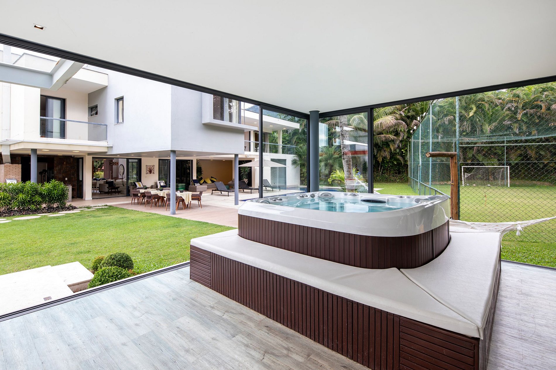La propiedad cuenta con un gran patio trasero con piscina, área gourmet, campo de fútbol, cancha de voleibol, cocoteros con hamacas para relajarse, un increíble jacuzzi interior en la habitación.
