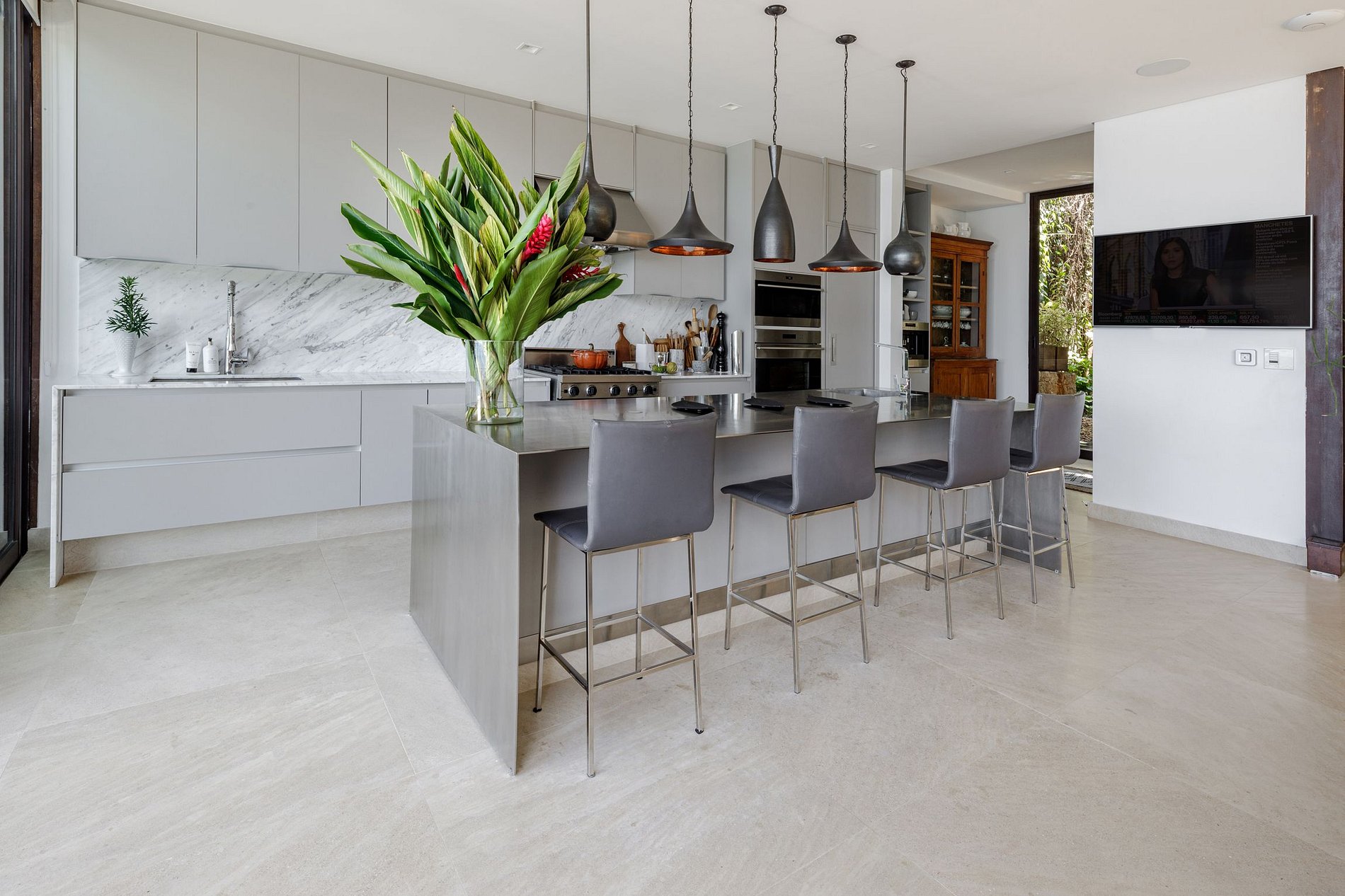 Esta hermosa mansión es besada constantemente por la ligera brisa marina, que refresca toda la zona exterior durante todo el día. Su terraza es amplia, brindando increíbles vistas y albergando además una alberca infinity lineal que está rodeada por un área social con sillas y un moderno fire pit. Al lado está la cocina gourmet con zona de barbacoa.