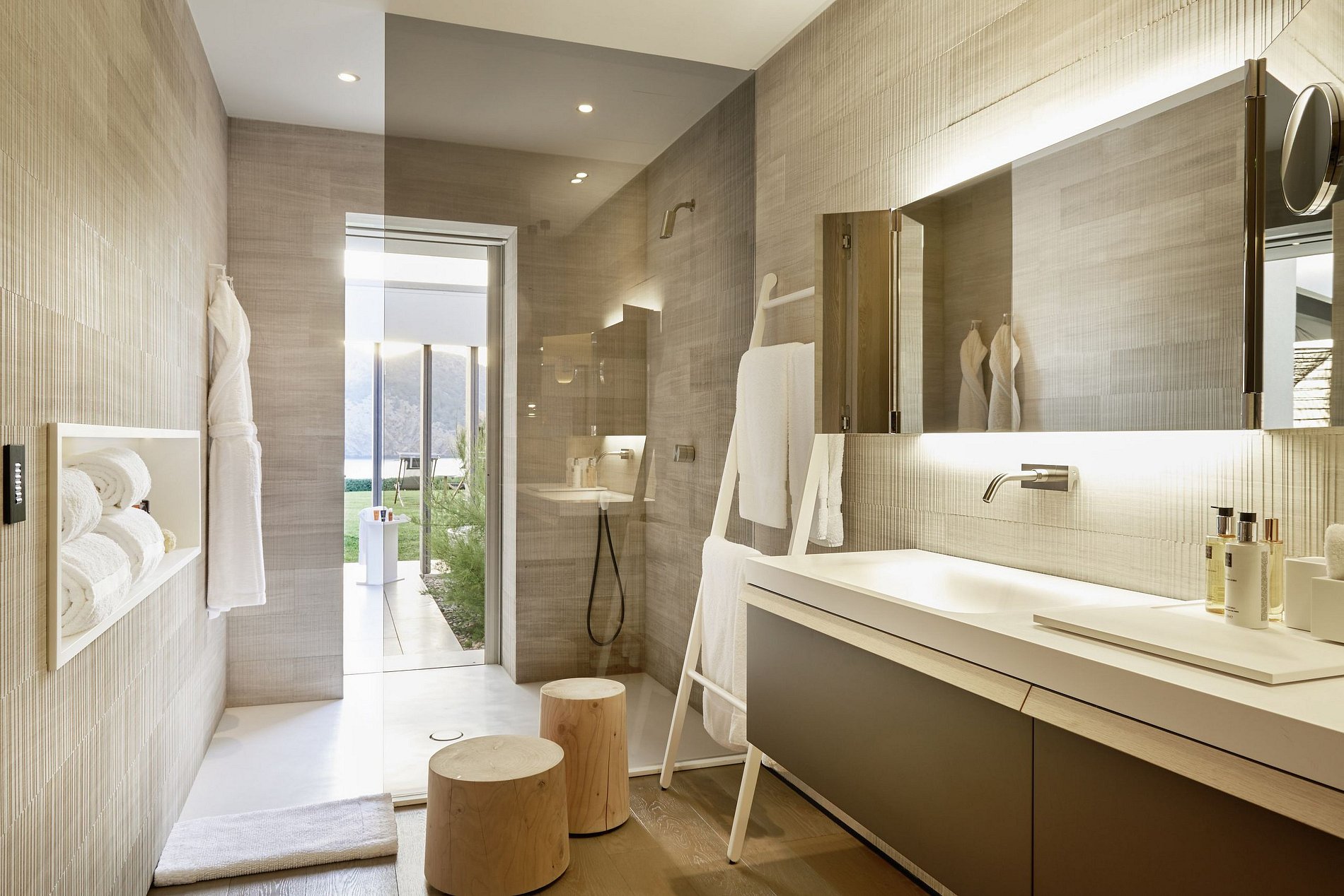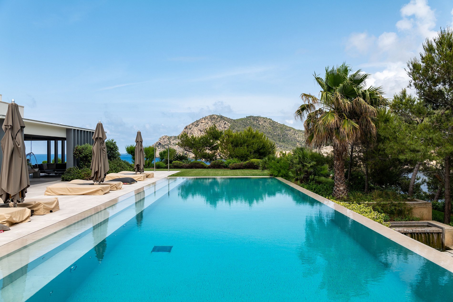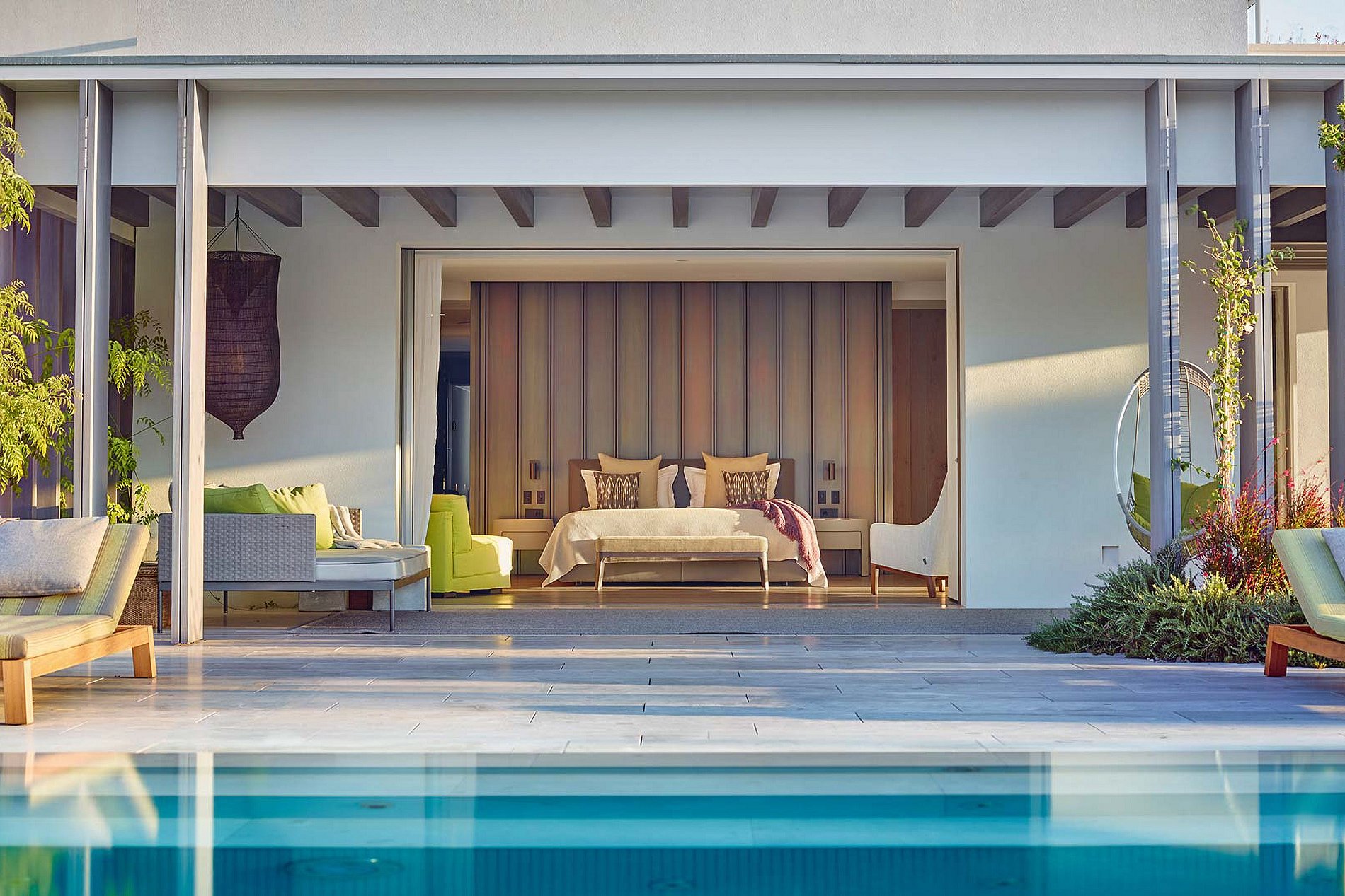 El exterior de la isla es un refugio para el relax y el placer, presentando dos impresionantes piscinas: una piscina infinita de 23 metros adornada con tumbonas y una piscina estilo laguna ubicada dentro de exuberantes jardines tropicales.