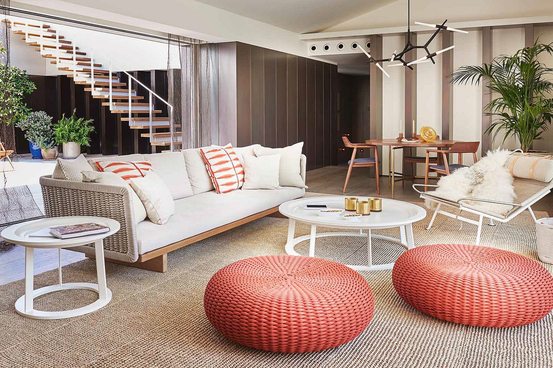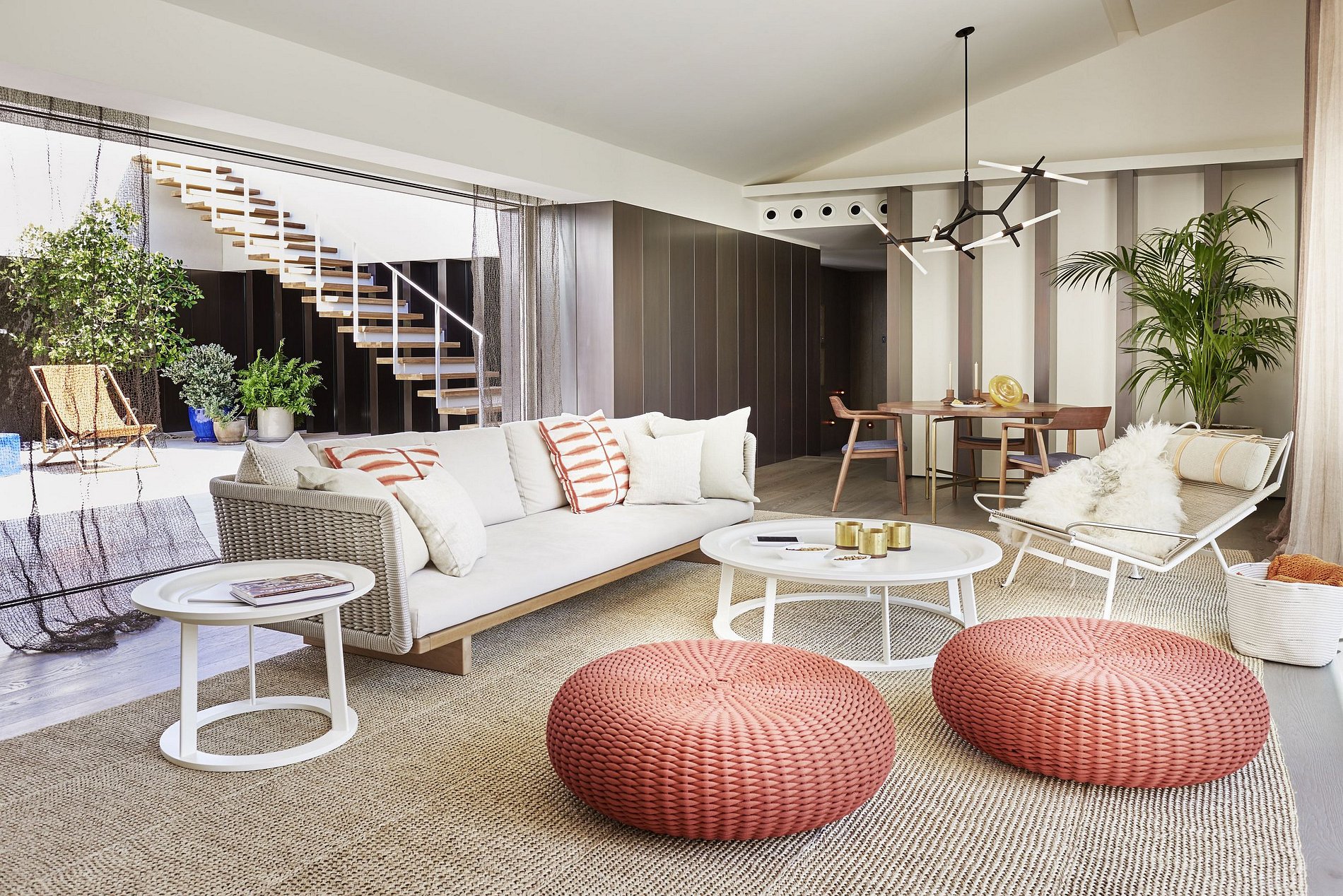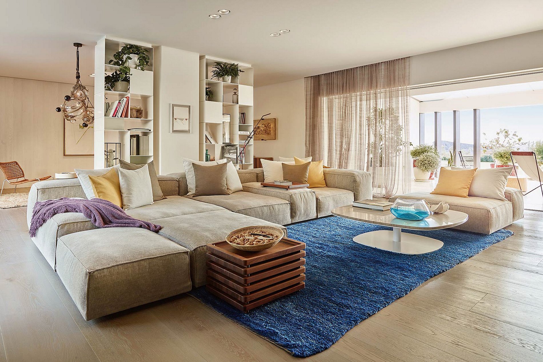 En el interior, la villa exuda una atmósfera serena de Ibiza con sus espacios frescos y aireados vestidos con texturas naturales cálidas, esquemas de colores neutros y arte local seleccionado, encarnando la esencia relajada de la isla. El corazón de la villa, un amplio patio central, está rodeado por tres salas de estar elegantemente decoradas y un comedor, todos adornados en un estilo balear chic. Las ventanas de suelo a techo se retraen perfectamente en las paredes, fusionando la elegancia interior con el encanto al aire libre a través de varias terrazas, ofreciendo bares, áreas tranquilas para relajarse y opciones de comedor al aire libre.