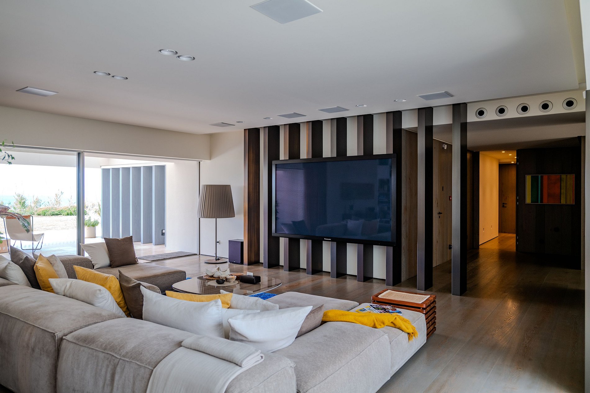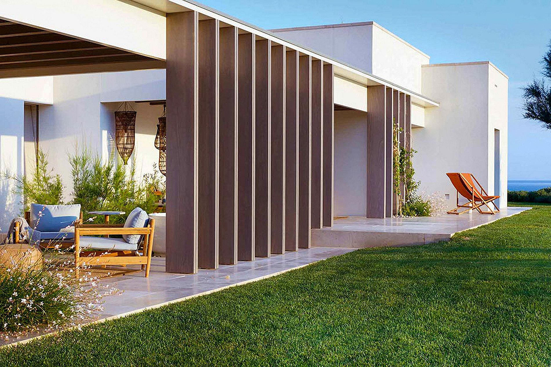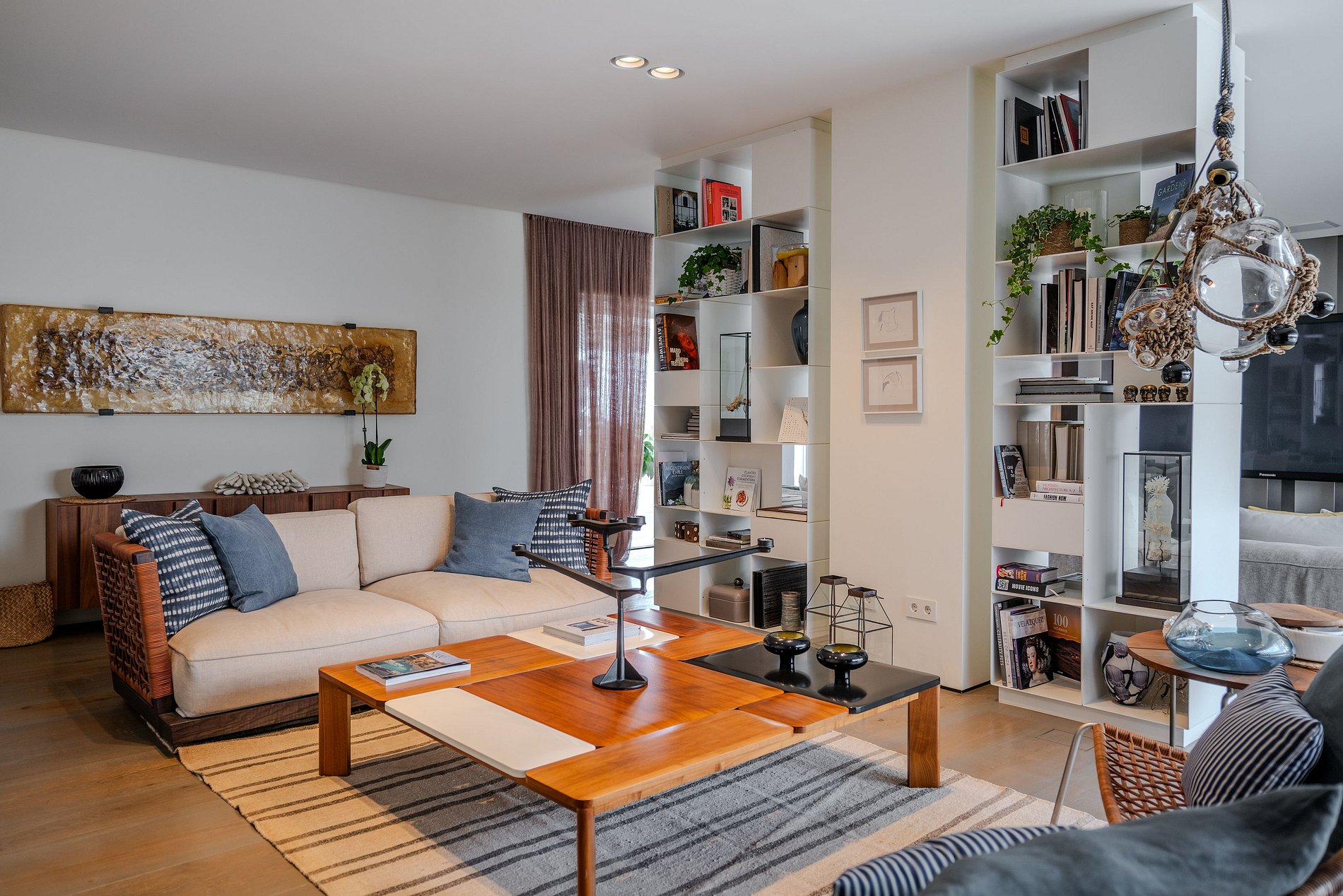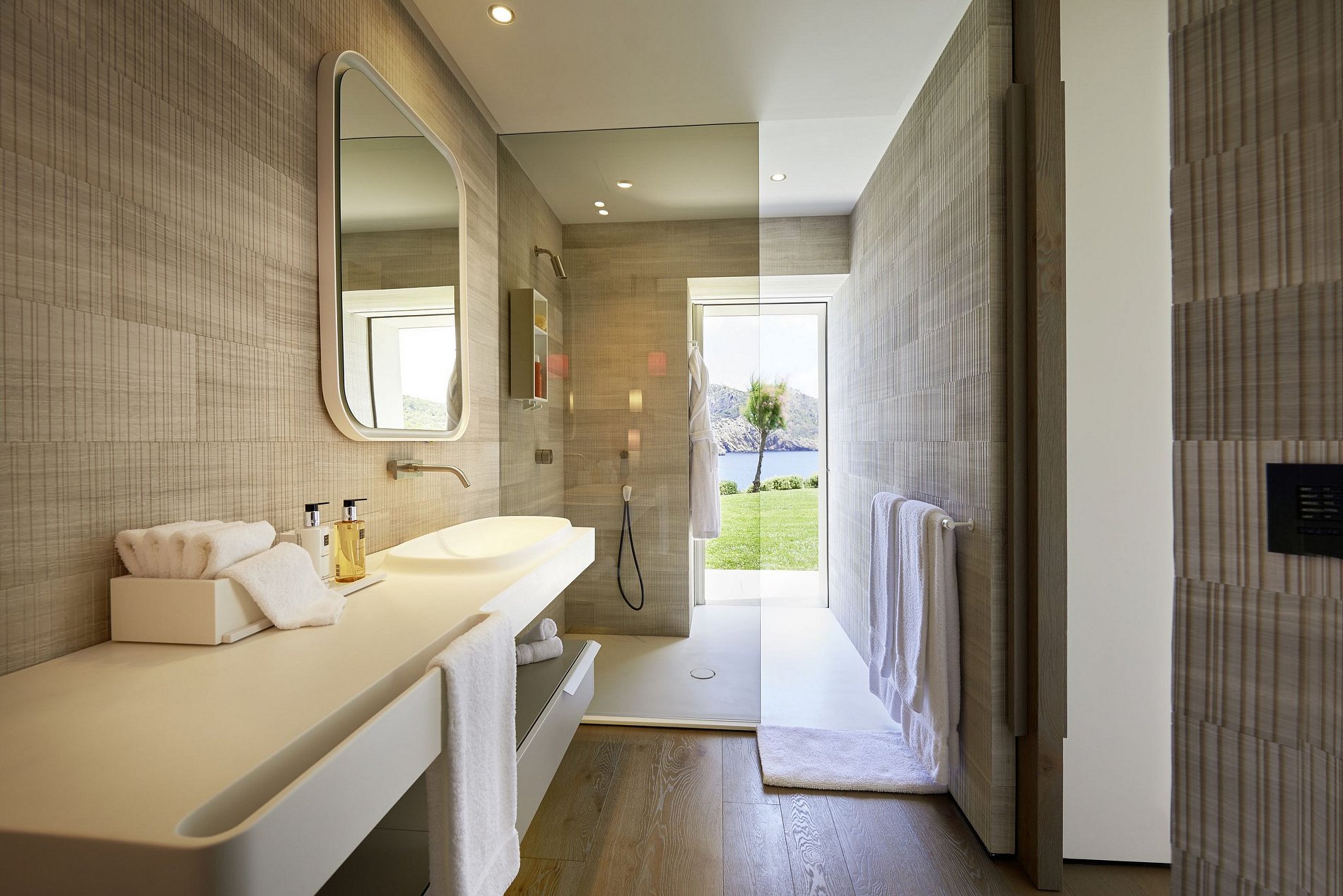 En el interior, la villa exuda una atmósfera serena de Ibiza con sus espacios frescos y aireados vestidos con texturas naturales cálidas, esquemas de colores neutros y arte local seleccionado, encarnando la esencia relajada de la isla. El corazón de la villa, un amplio patio central, está rodeado por tres salas de estar elegantemente decoradas y un comedor, todos adornados en un estilo balear chic. Las ventanas de suelo a techo se retraen perfectamente en las paredes, fusionando la elegancia interior con el encanto al aire libre a través de varias terrazas, ofreciendo bares, áreas tranquilas para relajarse y opciones de comedor al aire libre.