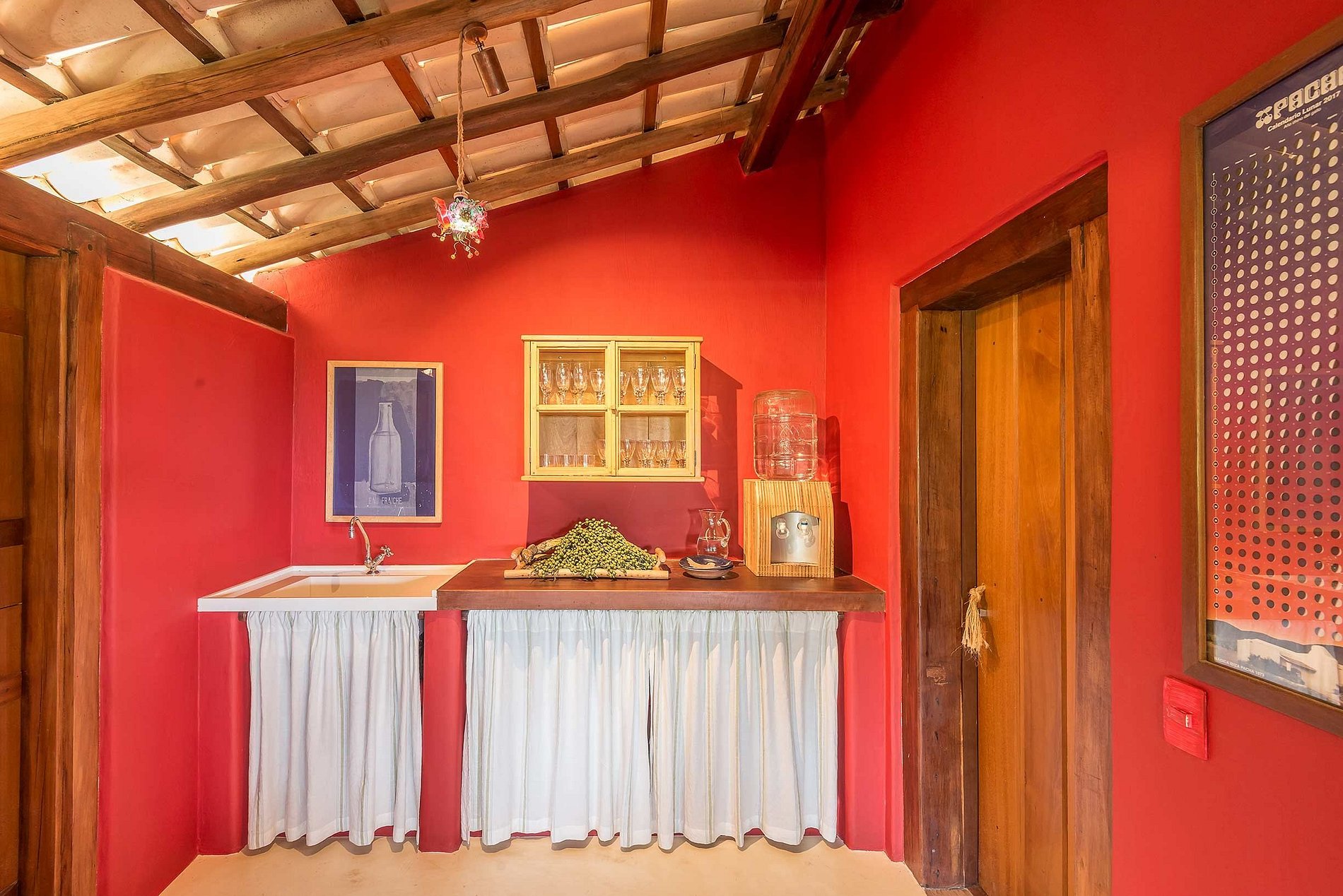 Los huéspedes pueden disfrutar del inmenso espacio en la planta baja de la casa principal, formados por 2 salones internos, las mesas invitadas de la cocina abierta y de una gran área externa cubierta, con sus sofás, sillones y obras de artes locales.