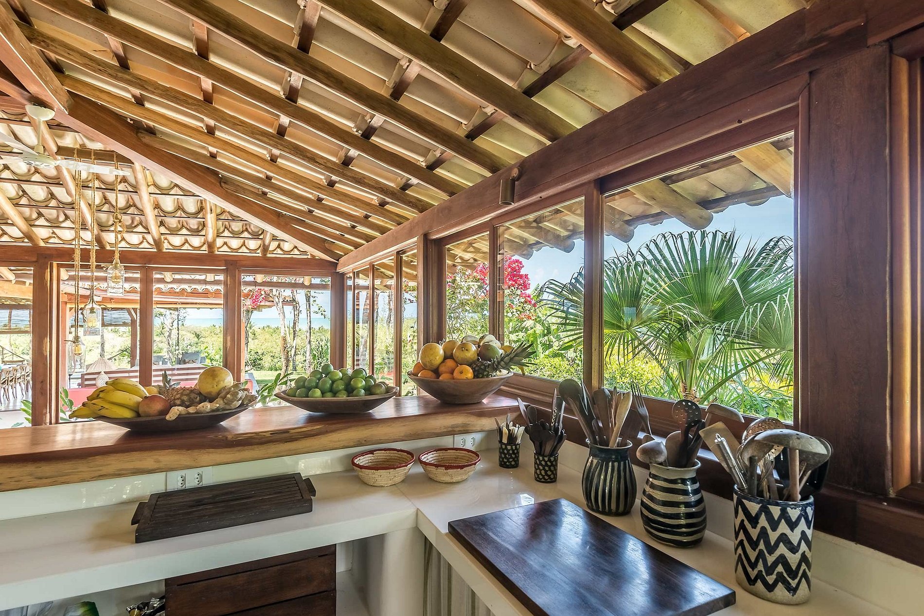 En la punta del hermoso jardín tropical, la piscina tiene un agradable pergolado, una hermosa vista al mar y muebles confortables instalados en el deck alrededor, lugar ideal para pasar horas aprovechando de cada instante.