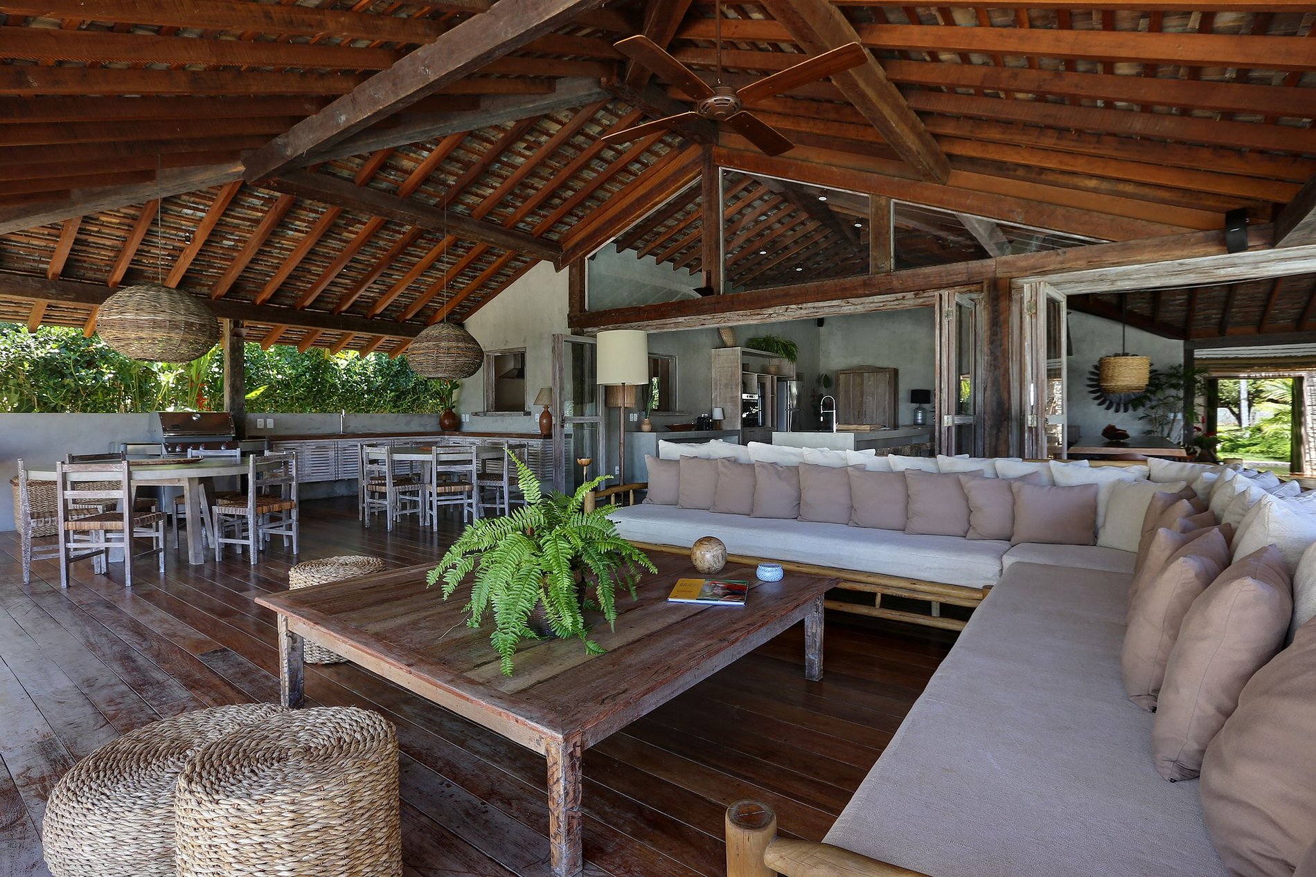 Espacios de vida con una impresionante volumetría, compuestos de un gran salón aireado, abierto a cada lado en la piscina y en el jardín tropical, una cocina moderna toda equipada y su espectacular mesa de madera maciza para 12 personas frente a una bancada cumplida de cemento quemado moderno.