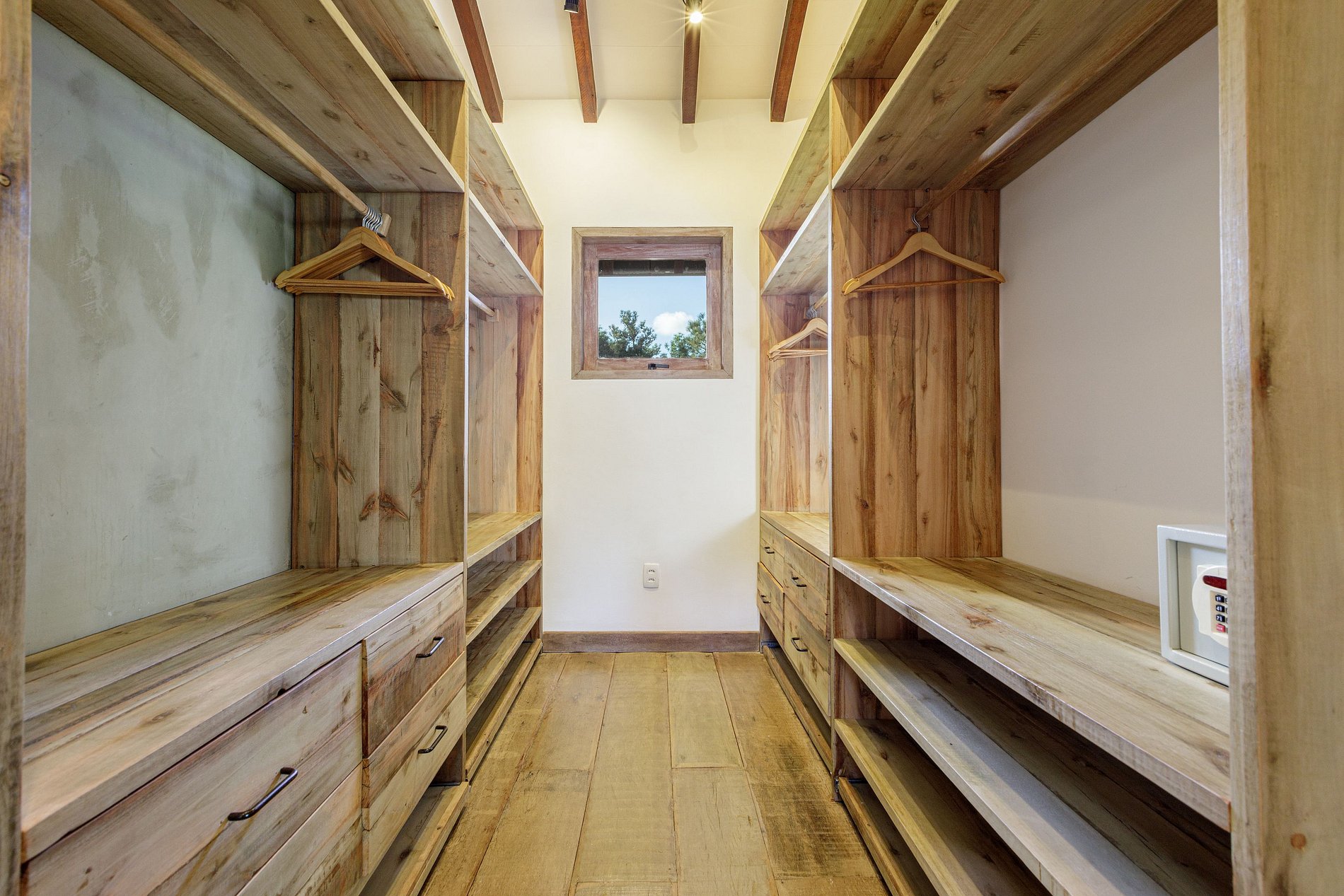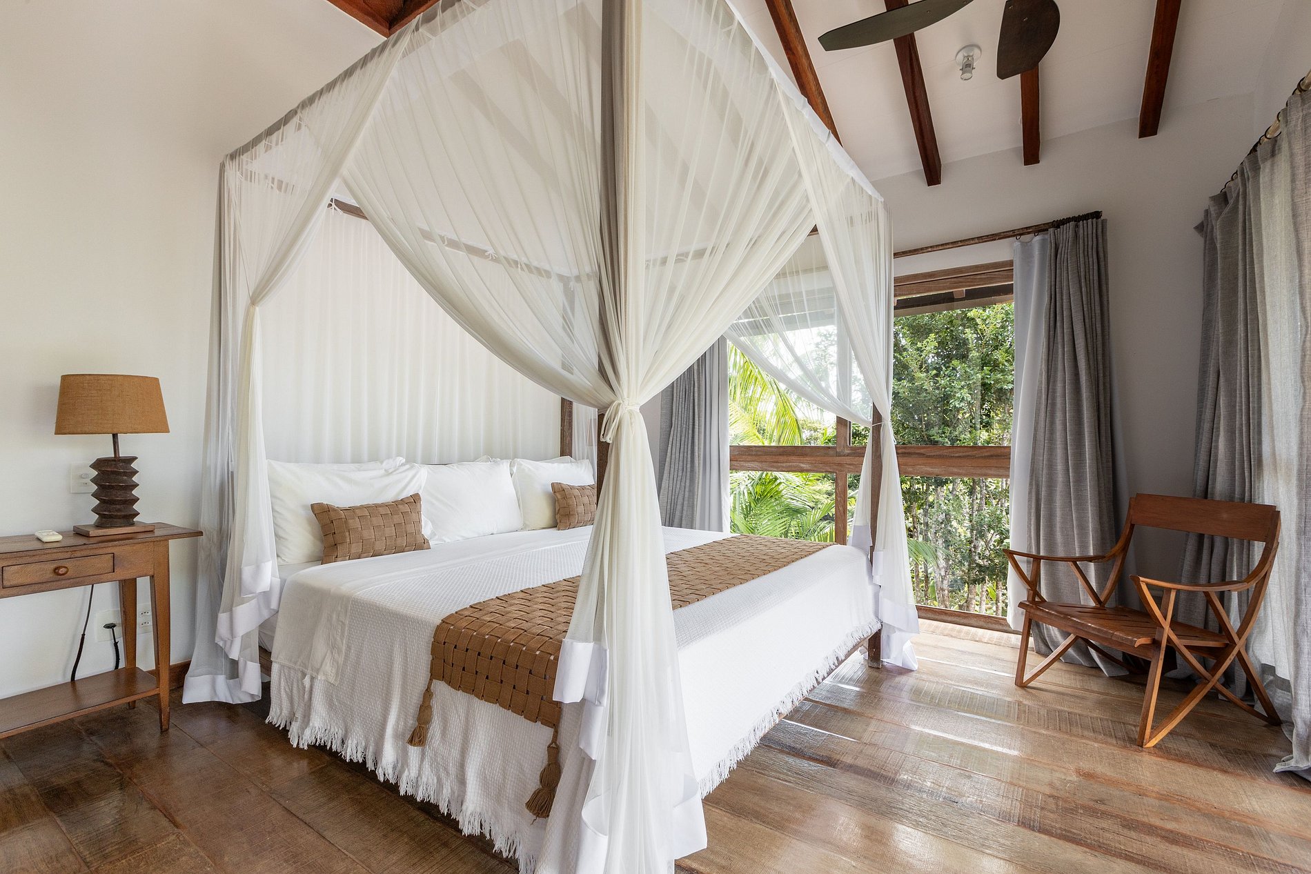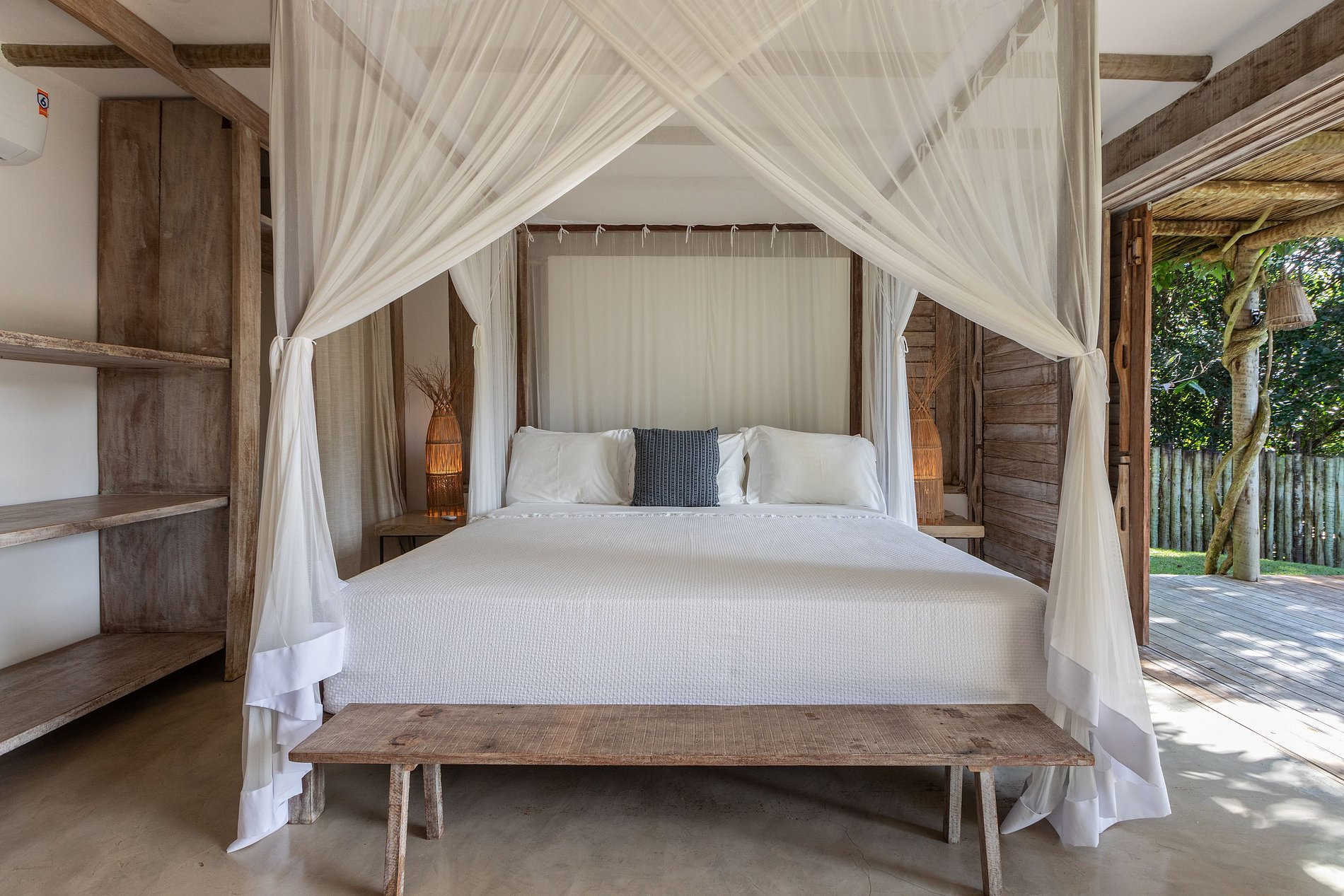 Una verdadera invitación a la relajación. Las suites ofrecen una cama king size con dosel y mosquitero, combinando a la perfección lujo y rusticidad. Los pisos y muebles de madera noble crean un ambiente acogedor. Los amplios ventanales con vistas a la naturaleza proporcionan luz natural y una vista inspiradora. Detalles como sillones de madera, un gabinete con acabado rústico y una iluminación tenue completan la experiencia de confort y encanto.