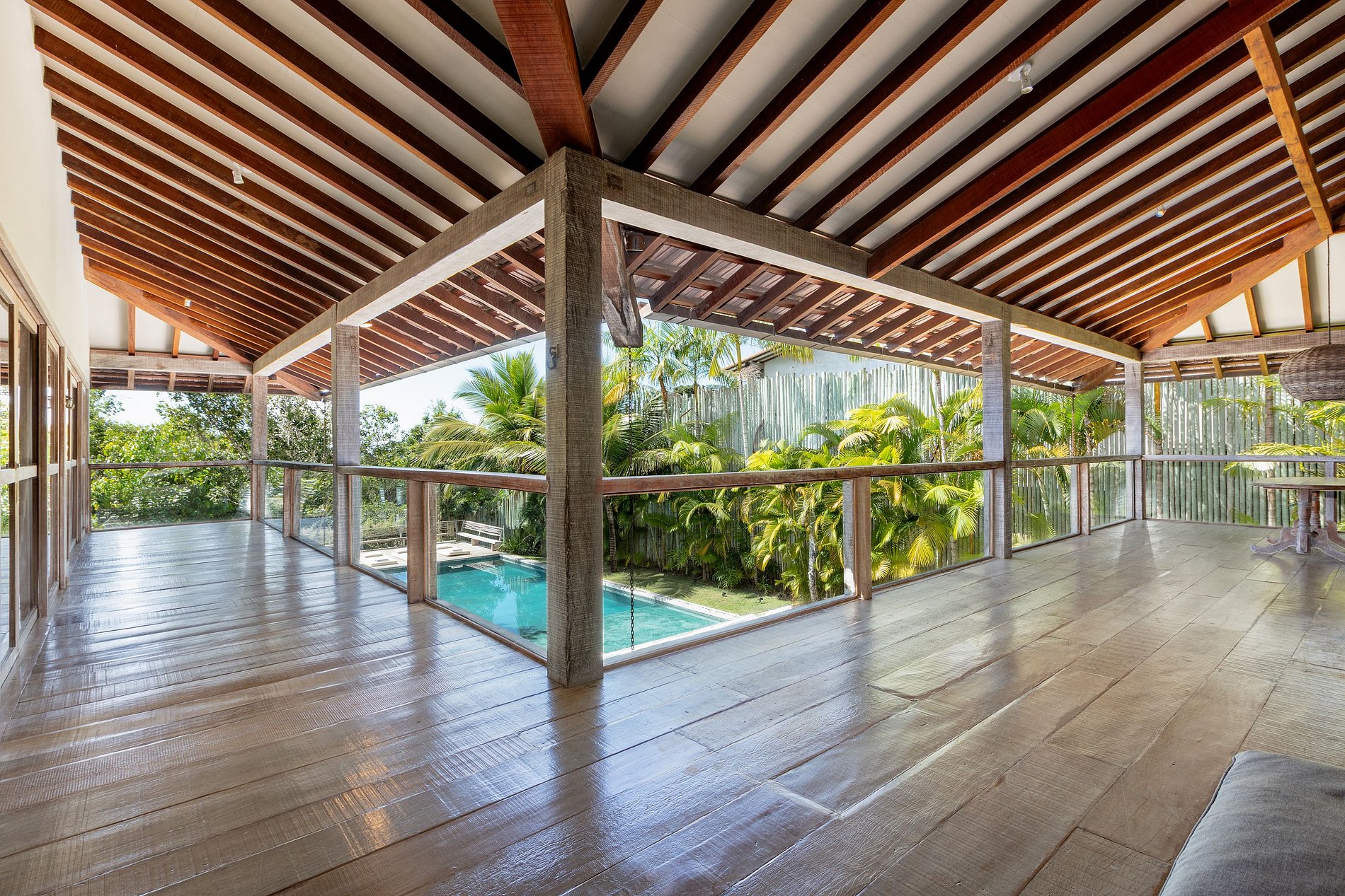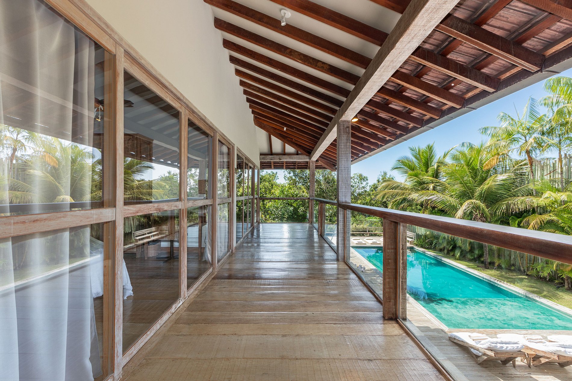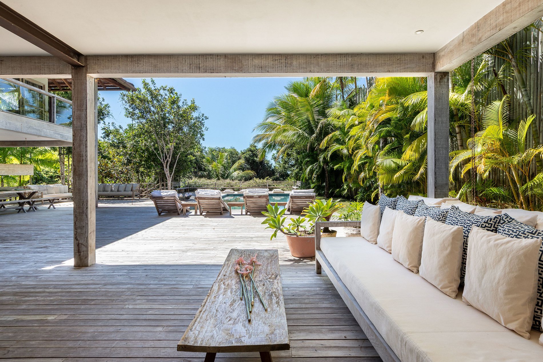 Las amplias áreas exteriores incluyen una piscina privada, camastros y un hermoso paisaje con cocoteros y árboles tropicales. Los espacios integrados de vidrio y madera permiten la entrada de luz natural y ventilación cruzada, creando un ambiente luminoso y acogedor.