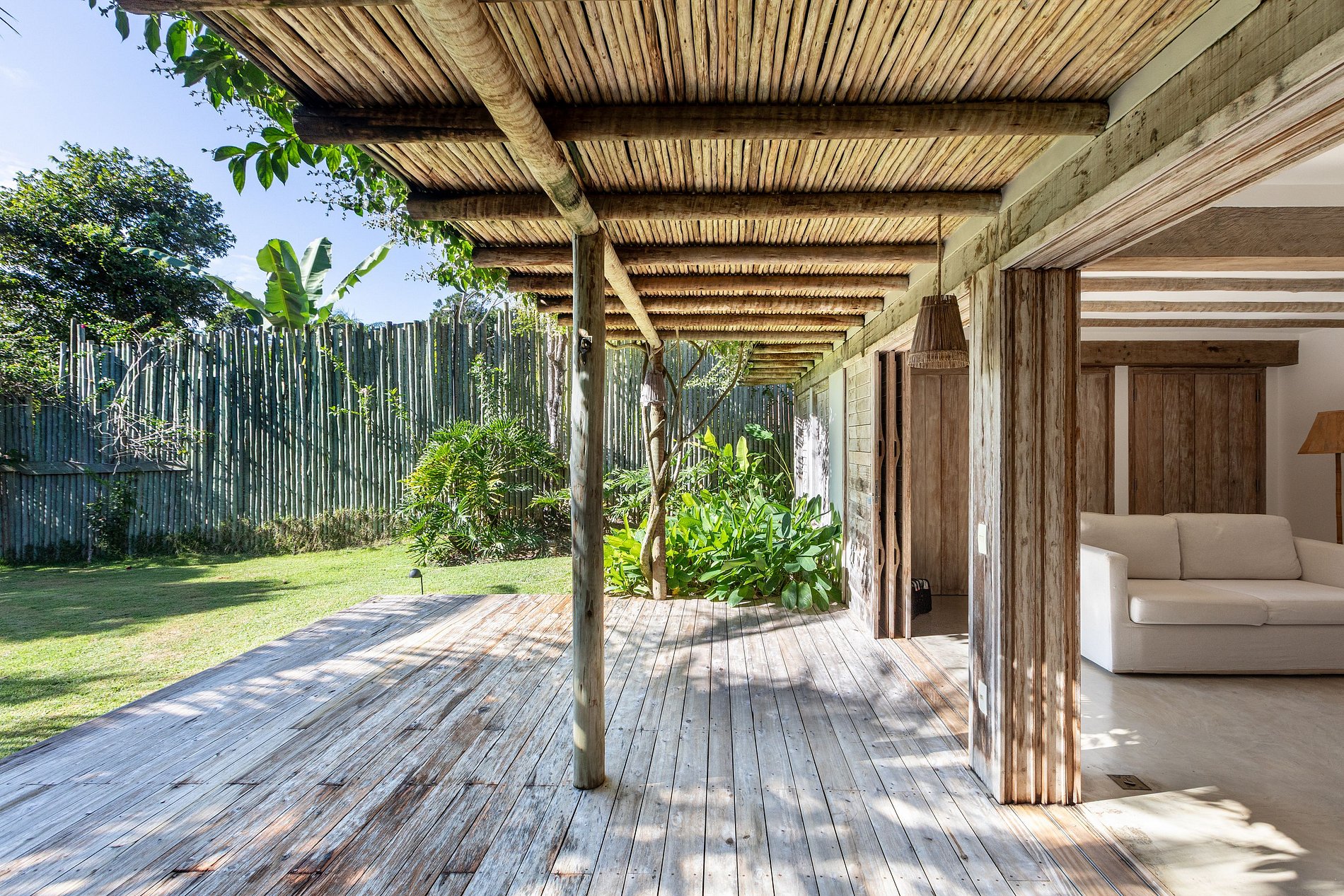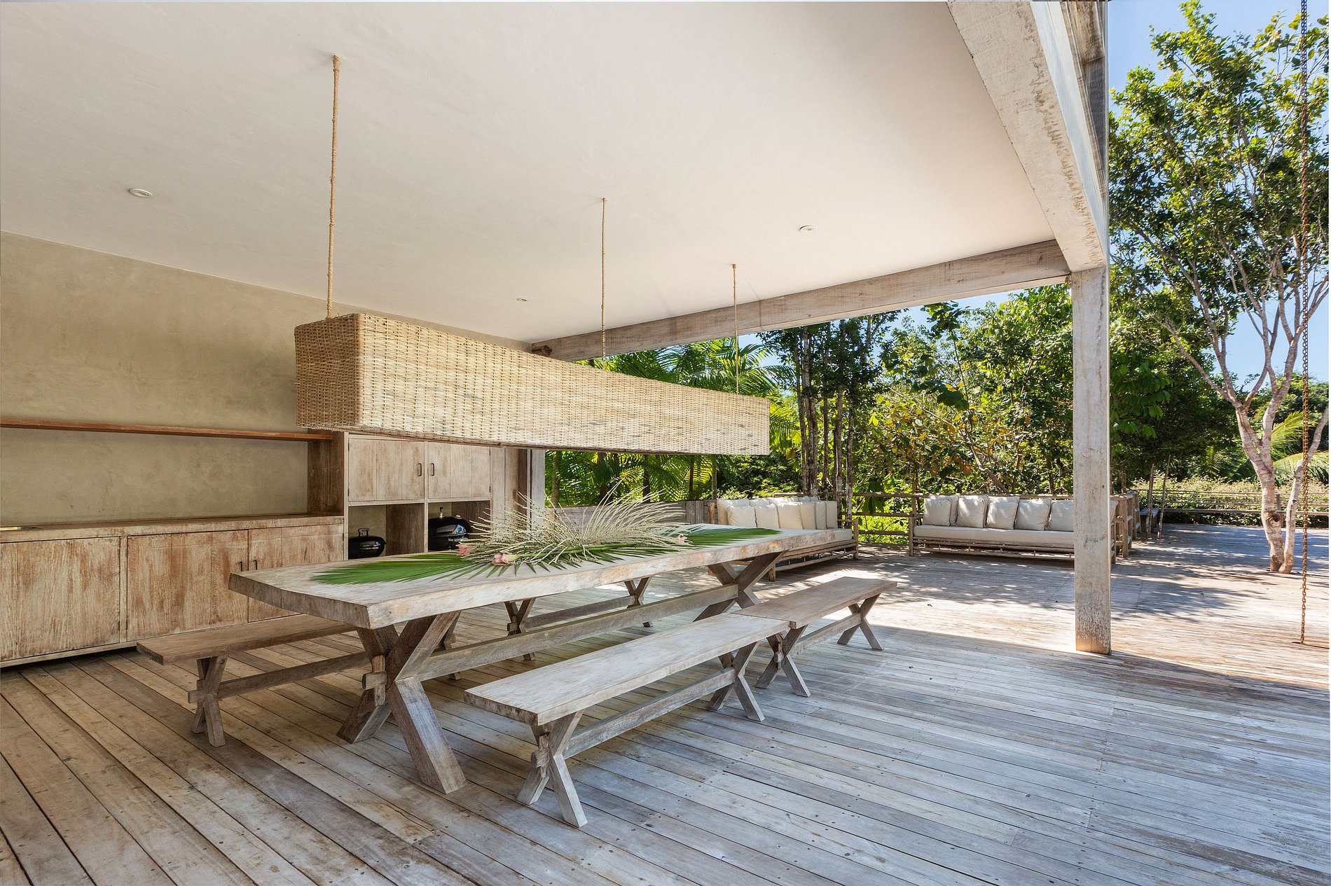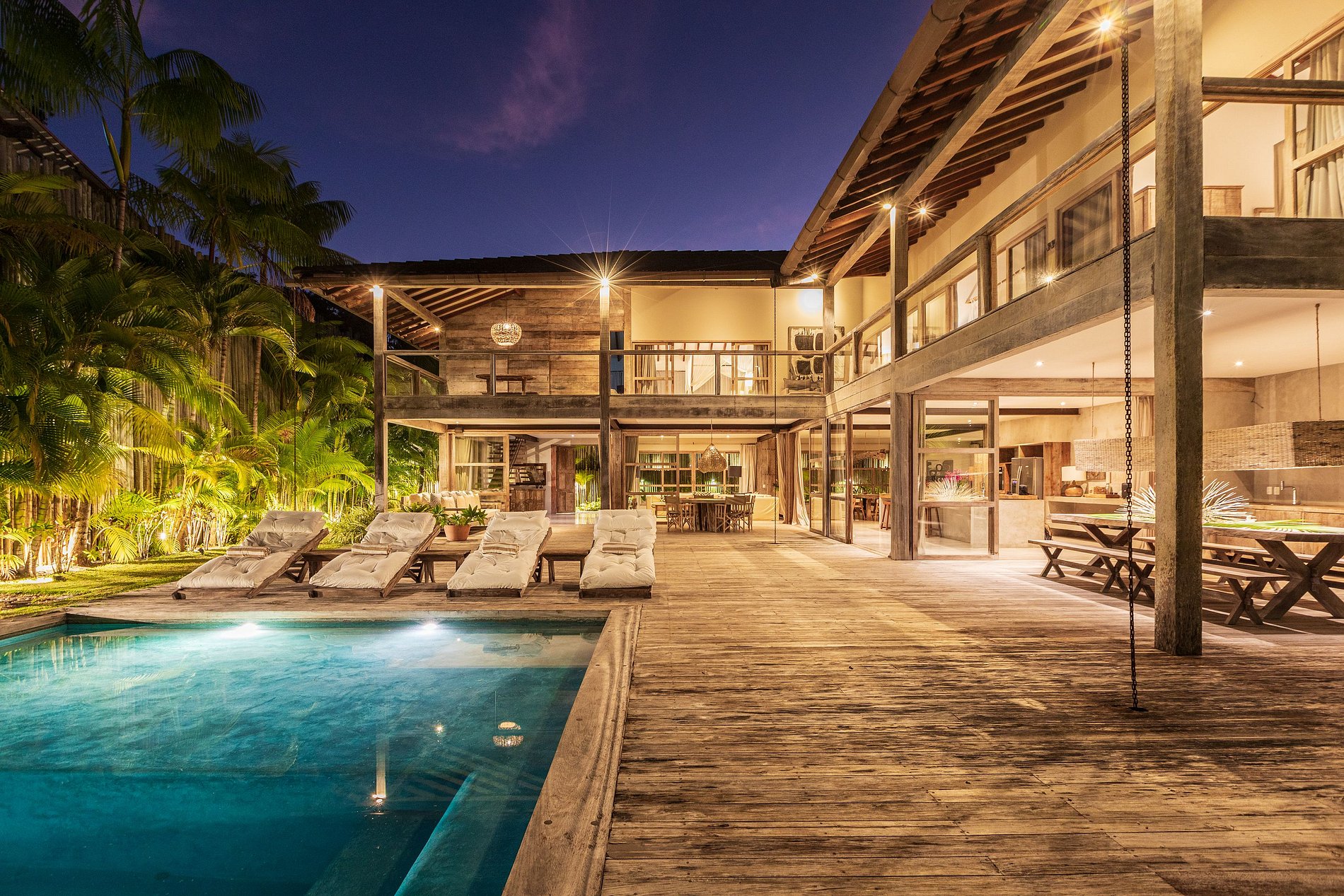 Las amplias áreas exteriores incluyen una piscina privada, camastros y un hermoso paisaje con cocoteros y árboles tropicales. Los espacios integrados de vidrio y madera permiten la entrada de luz natural y ventilación cruzada, creando un ambiente luminoso y acogedor.