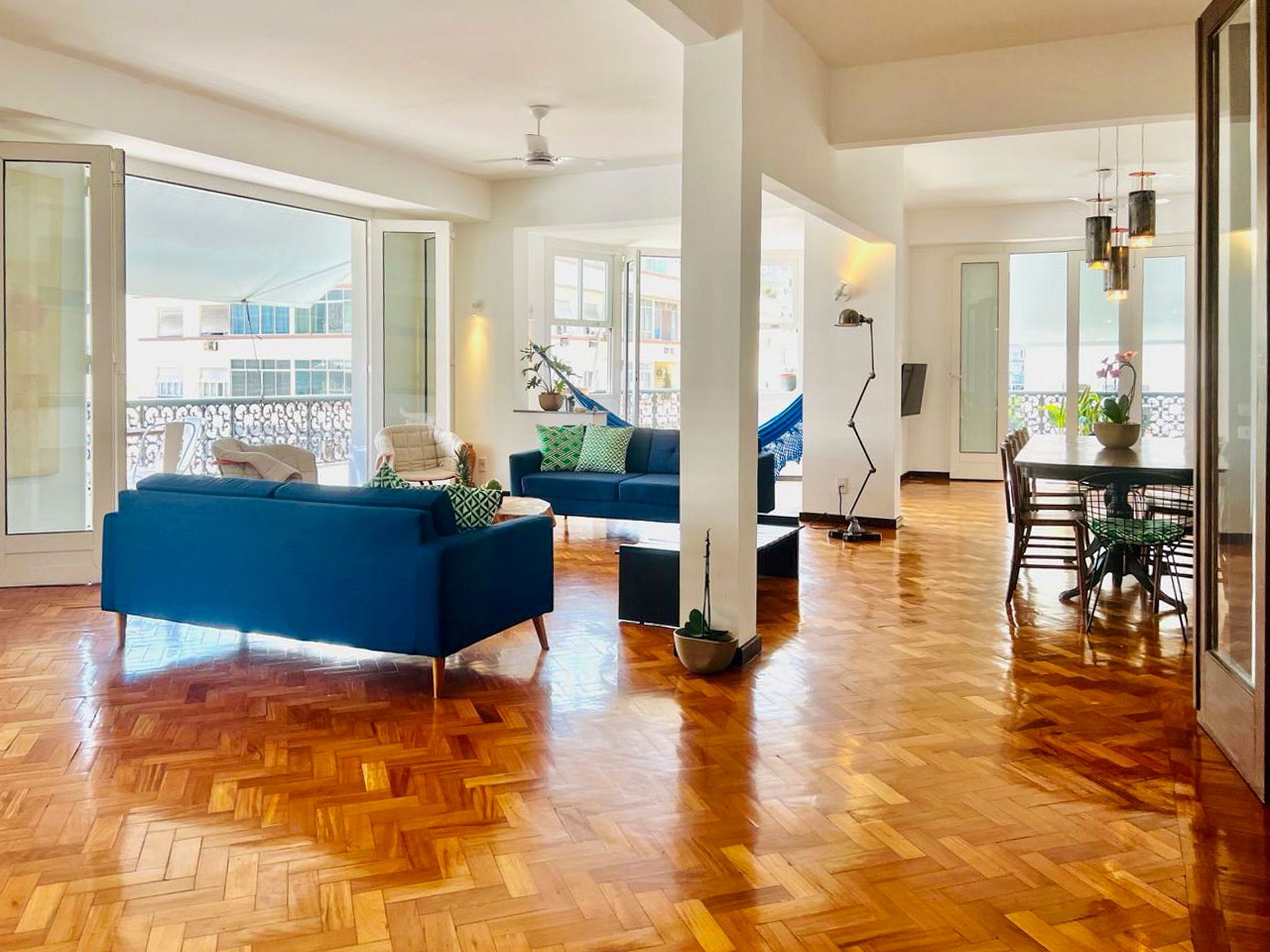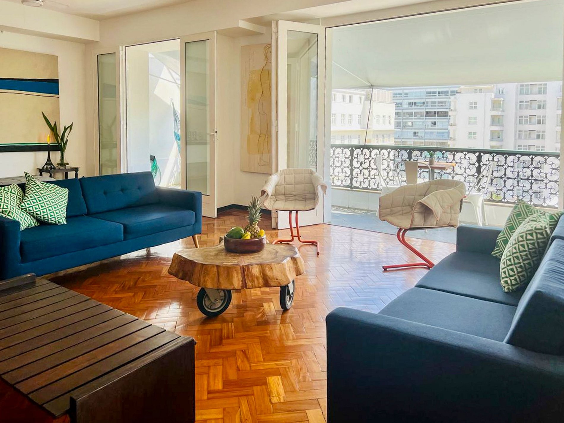 El salón, con sus ventanales panorámicos, es una invitación a admirar la belleza y la vitalidad de Copacabana sin salir de casa.