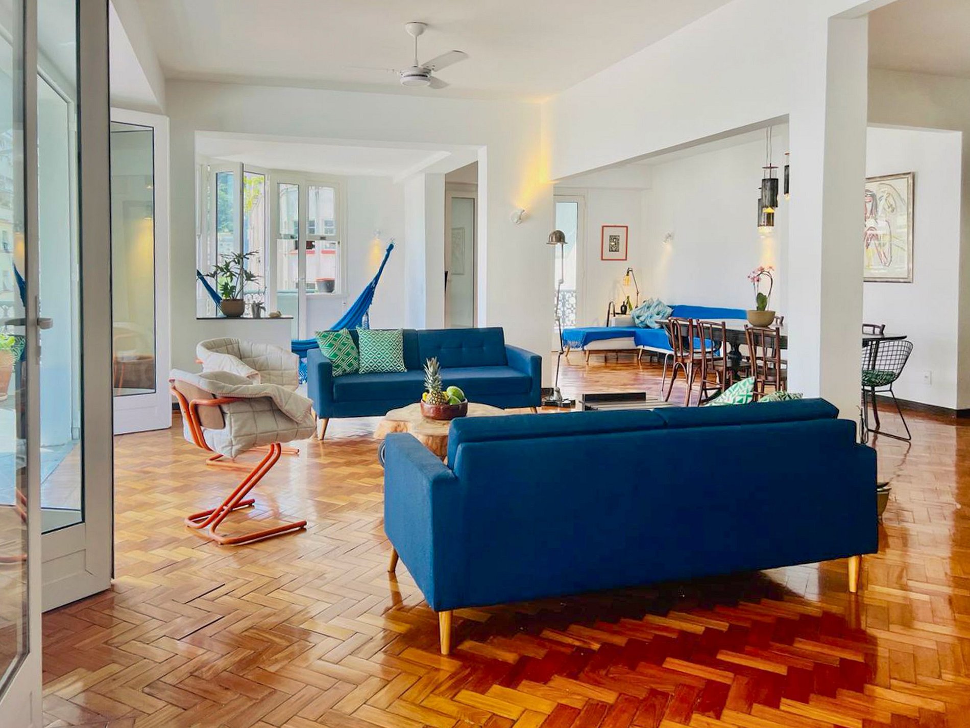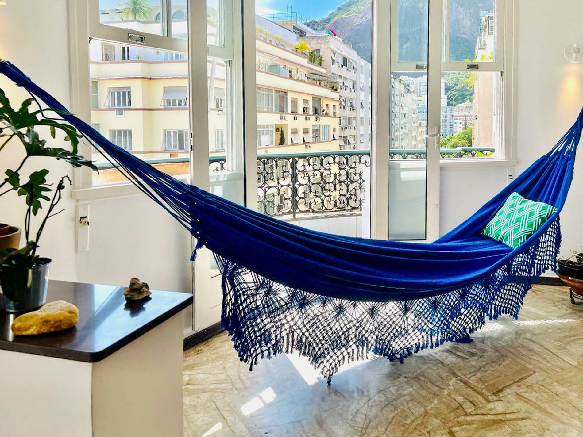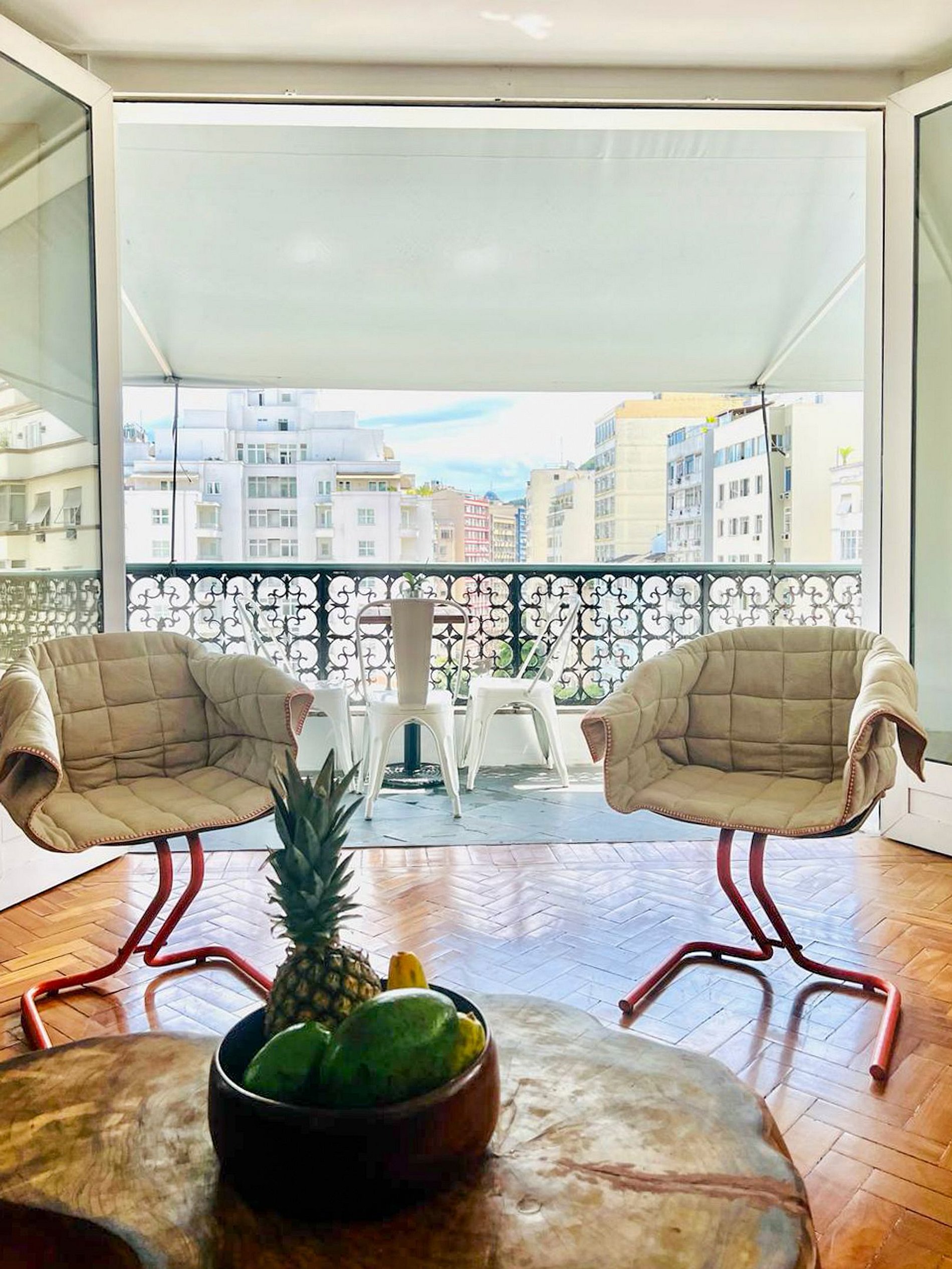 El salón, con sus ventanales panorámicos, es una invitación a admirar la belleza y la vitalidad de Copacabana sin salir de casa.