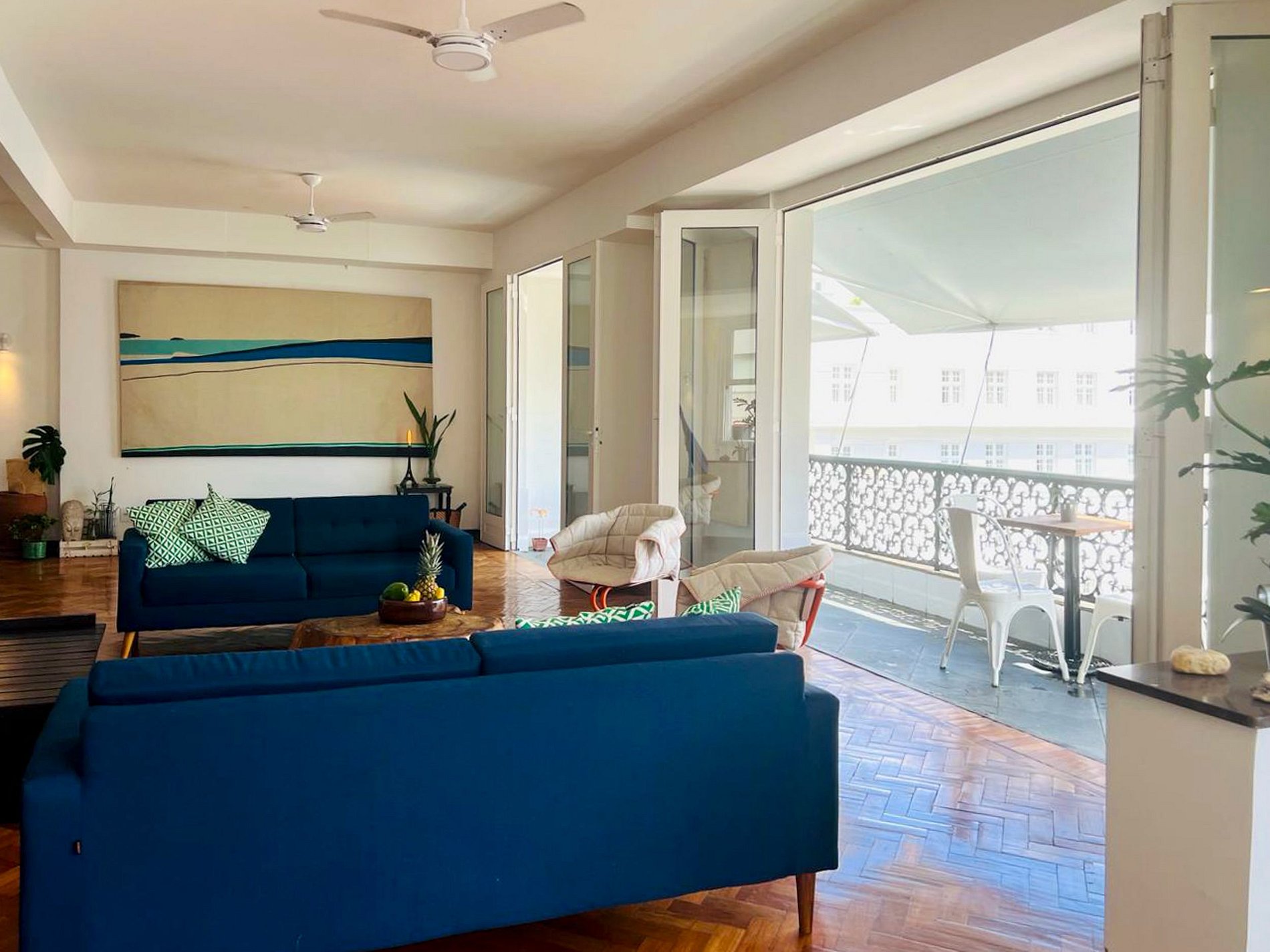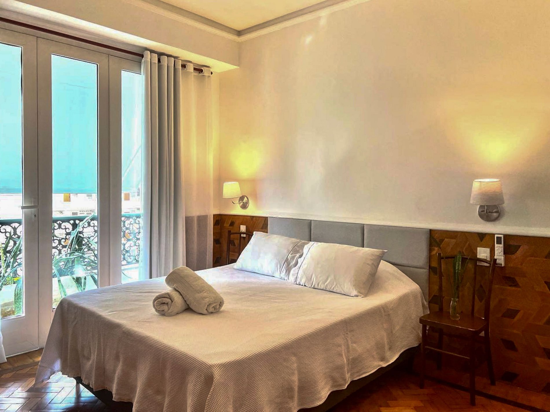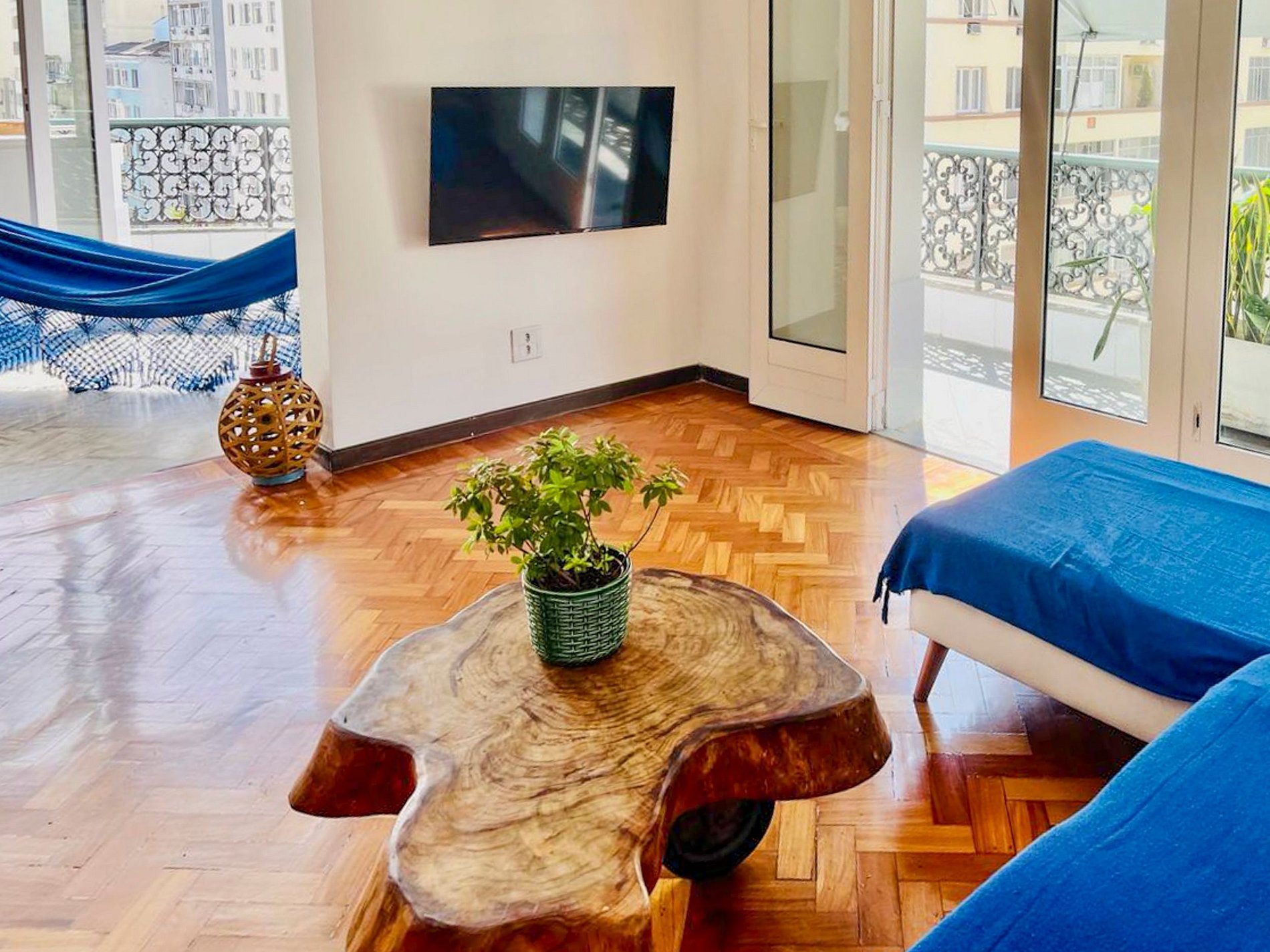 El salón, con sus ventanales panorámicos, es una invitación a admirar la belleza y la vitalidad de Copacabana sin salir de casa.