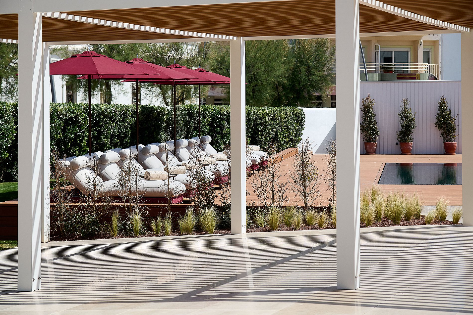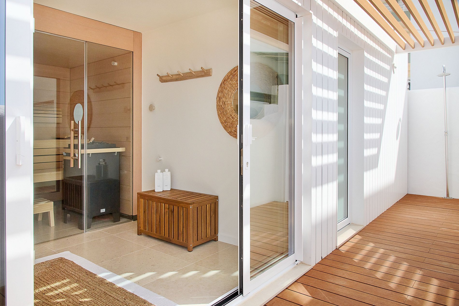 La terraza construida sobre el antiguo muro marítimo parece flotar sobre el mar. El espacio exterior cuenta con piscina climatizada, terraza solárium, y una zona de bienestar con sala de tratamientos y sauna — el escenario perfecto para momentos especiales con amigos o familia.
