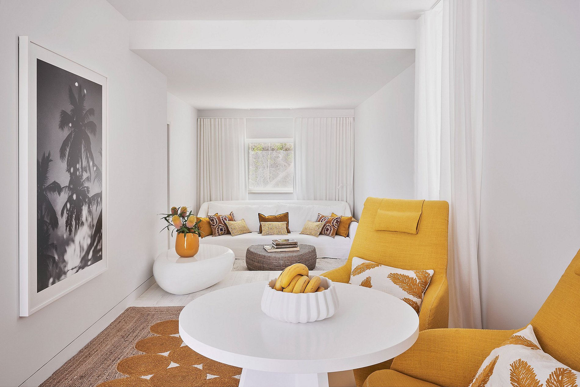 Un dúplex de estética ligera y relajada, con suelos blancos de madera, acentos de color y estilo desenfadado. Incluye una suite con terraza y baño en el piso superior, y una habitación tipo estudio con baño completo en la planta baja.