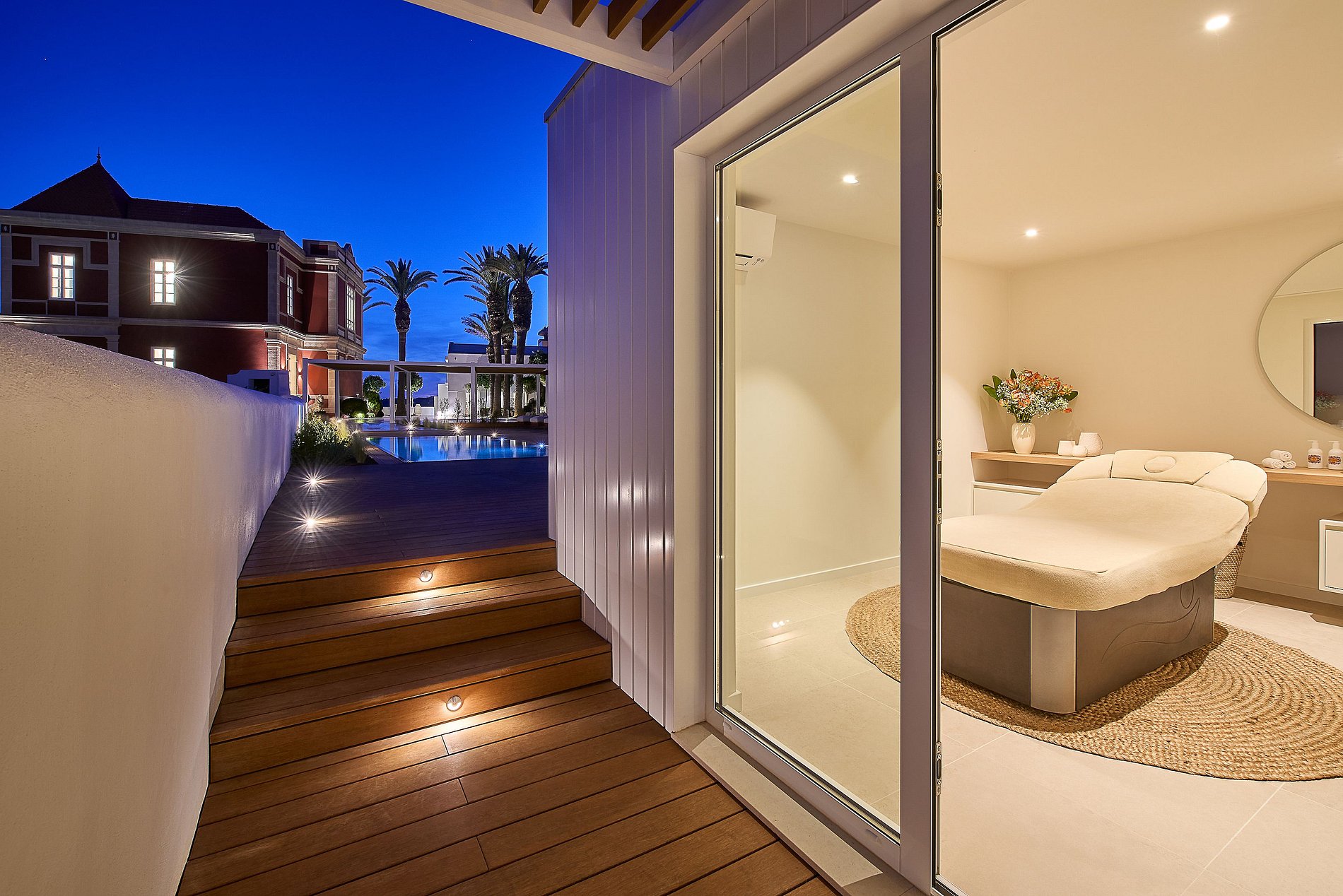 La terraza construida sobre el antiguo muro marítimo parece flotar sobre el mar. El espacio exterior cuenta con piscina climatizada, terraza solárium, y una zona de bienestar con sala de tratamientos y sauna — el escenario perfecto para momentos especiales con amigos o familia.