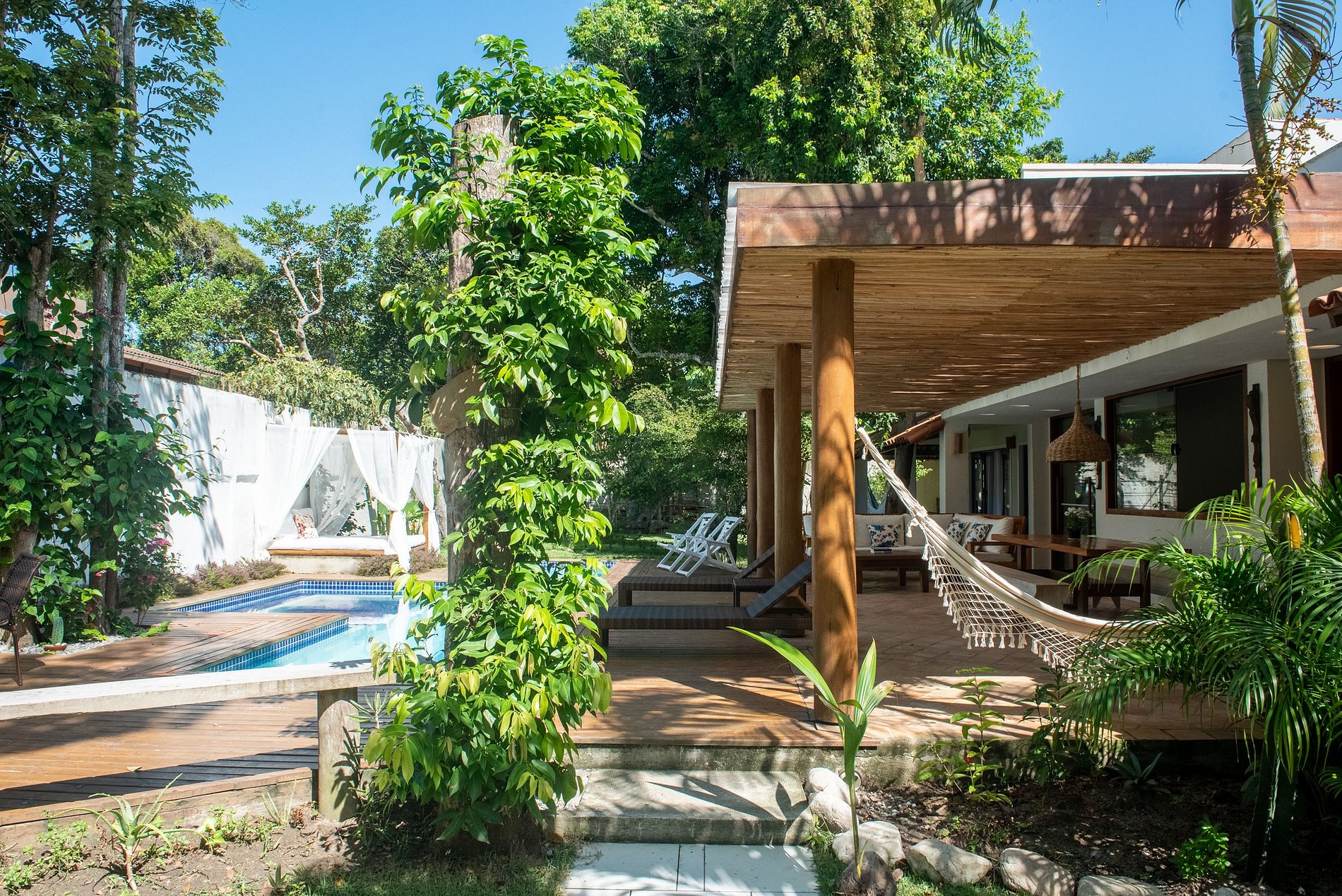 Su hermoso jardín está decorado con árboles y un amplio deck con piscina, tumbonas, cama con mosquiteras y quincho para preparar deliciosas parrilladas con familiares y amigos. Su terraza incluye una excelente sala de estar al aire libre con un comedor a solo unos pasos de la piscina.