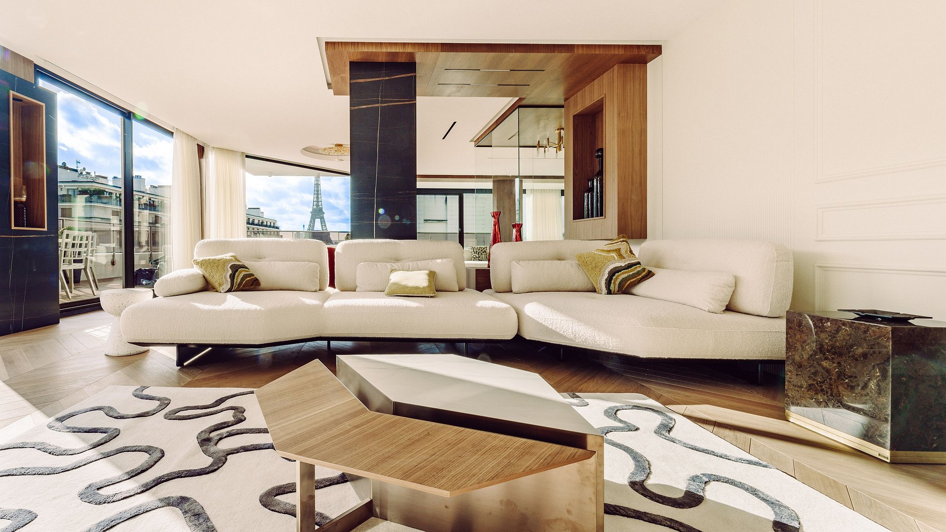 Las áreas de estar son espaciosas y están diseñadas de manera reflexiva, proporcionando un entorno ideal tanto para la relajación como para el entretenimiento. Grandes ventanas no solo bañan el interior con luz natural, sino que también ofrecen vistas impresionantes de la ciudad, mezclando la belleza de París con la comodidad del hogar.