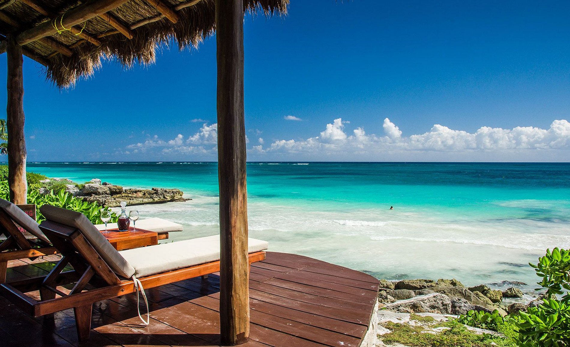 Una villa bellamente construida que cuenta con una gran sala de palapa con vistas panorámicas de la playa y el mar. Esta extraordinaria casa frente al mar está situada a lo largo de la carretera costera de la playa, a solo una milla y media al sur de las antiguas ruinas mayas de Tulum junto al acantilado, a poca distancia de algunos de los mejores restaurantes de Tulum.