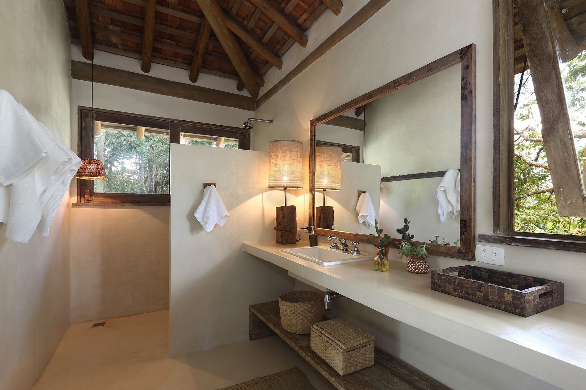 El gran espacio interior, con sala de estar y sala de TV tiene grandes ventanas conectando el área externa del balcón, a pocos pasos de la piscina donde se pueden sumergirse, y disfrutar de la belleza y la tranquilidad del lugar.La casa principal se sitúa en el pedazo más sombreado del jardín. Además de la gran sala y cocina, existe una suite que se abre totalmente en el jardín donde los árboles sirven también de soporte para redes.