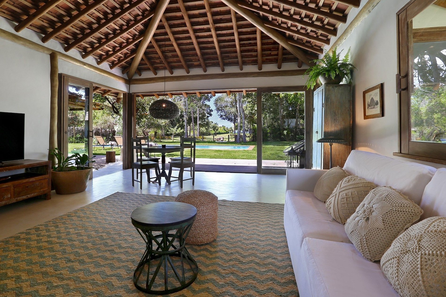 El gran espacio interior, con sala de estar y sala de TV tiene grandes ventanas conectando el área externa del balcón, a pocos pasos de la piscina donde se pueden sumergirse, y disfrutar de la belleza y la tranquilidad del lugar.La casa principal se sitúa en el pedazo más sombreado del jardín. Además de la gran sala y cocina, existe una suite que se abre totalmente en el jardín donde los árboles sirven también de soporte para redes.