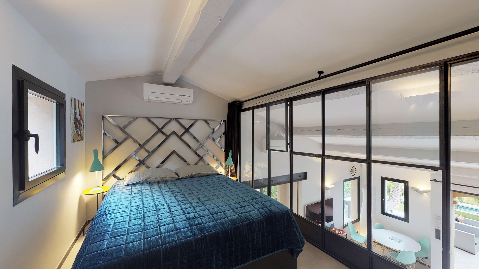 Este loft incluye dos dormitorios, cada uno abierto a la sala de estar con ventanas de vidrio, una cocina totalmente equipada, una piscina privada y una zona de barbacoa.