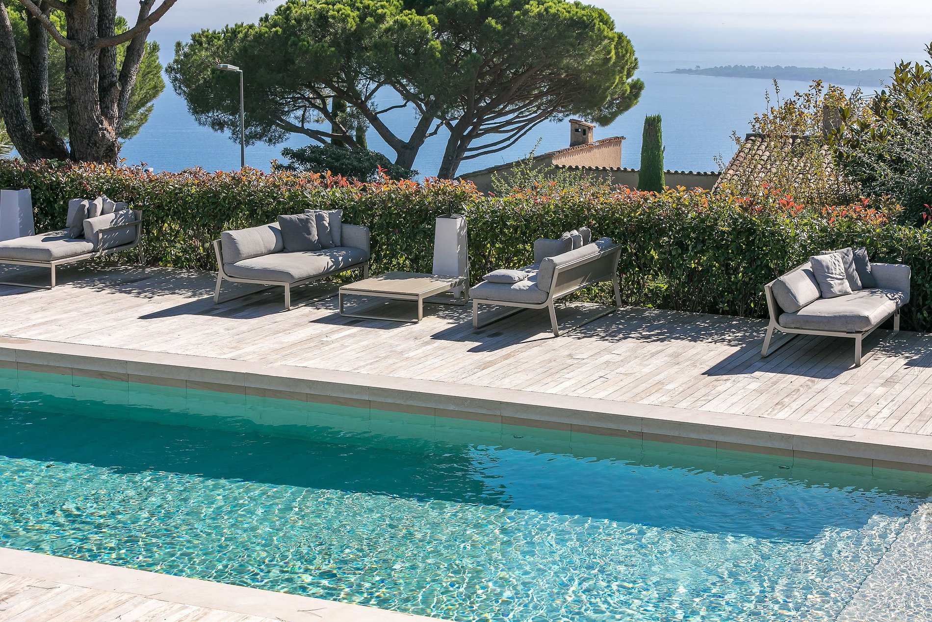 El área de la piscina, frente a las islas de Lérins, constituye un verdadero espacio de recepción:
