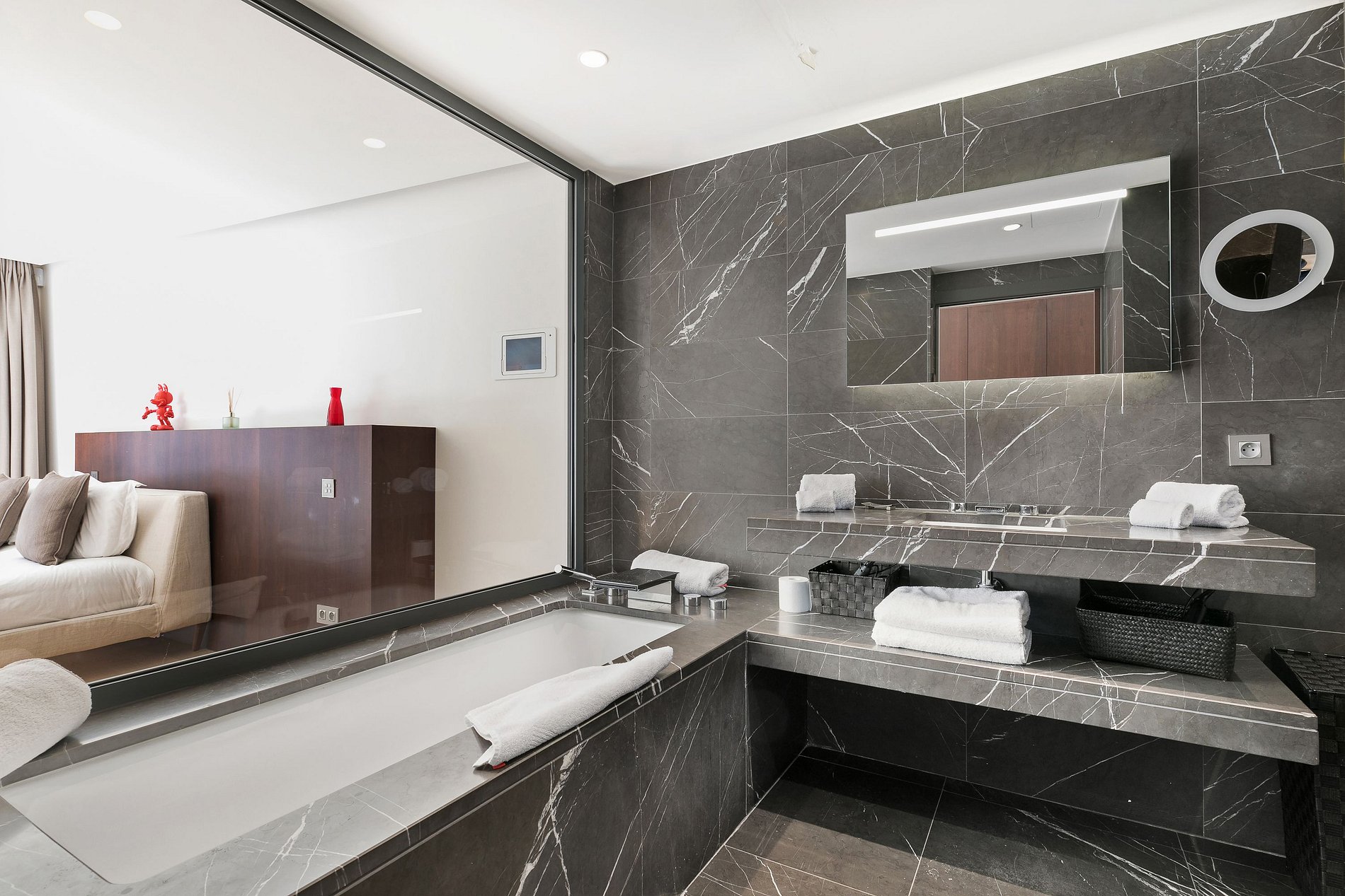 • Dormitorio 3: Suite doble (cama de 160 cm), TV, baño con ducha independiente, doble lavabo, WC, vestidor con caja fuerte, acceso a la terraza y vista al mar