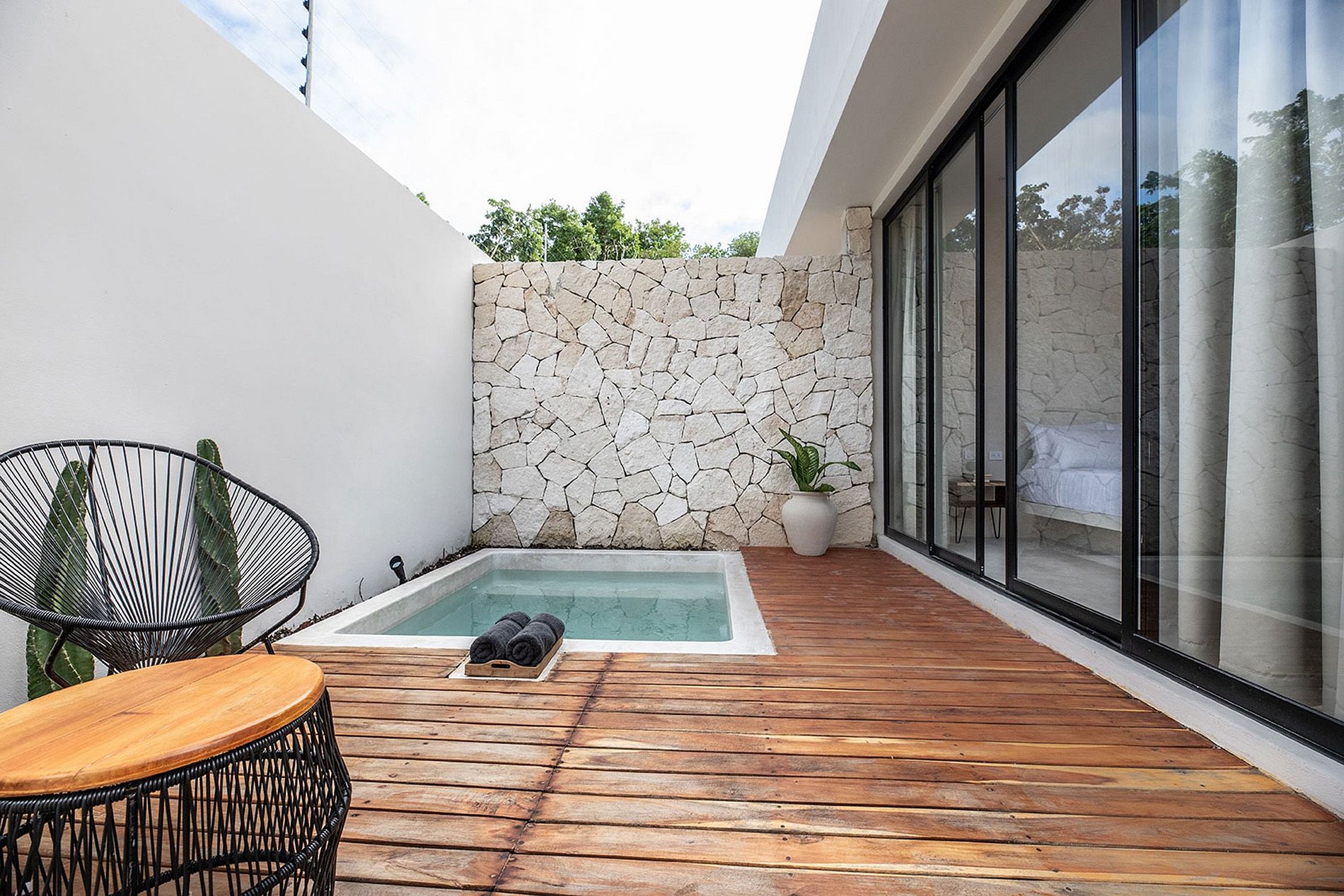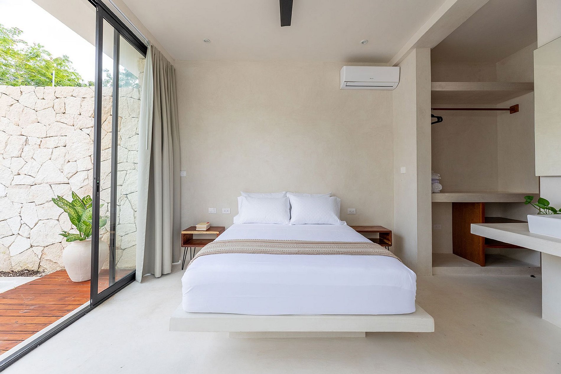 Cama Queen size, aire acondicionado, ventilador de techo, baño privado con ducha, piscina privada, caja de seguridad