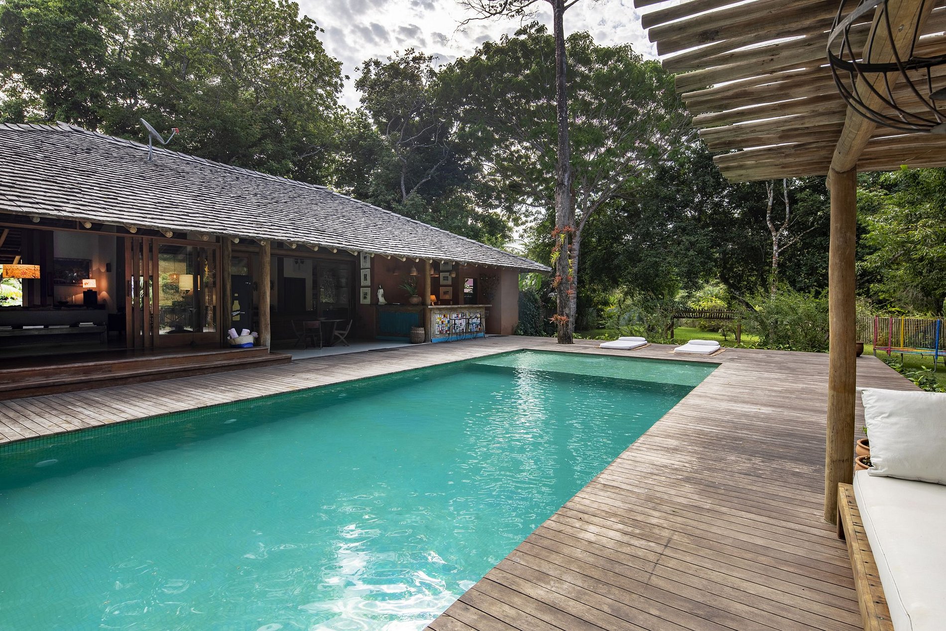 Linda casa de 3 suites en el condominio Altos de Trancoso.Jardín tropical agradable con una hermosa piscina, una pergola, un área con juguetes para los niños. En el balcón, una mesa, un bar y su barbacoa, ofrece un espacio cómodo para las bellas tardes soleadas.