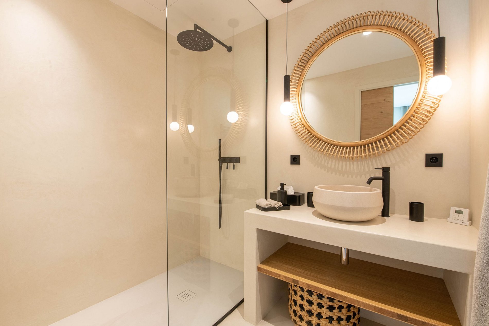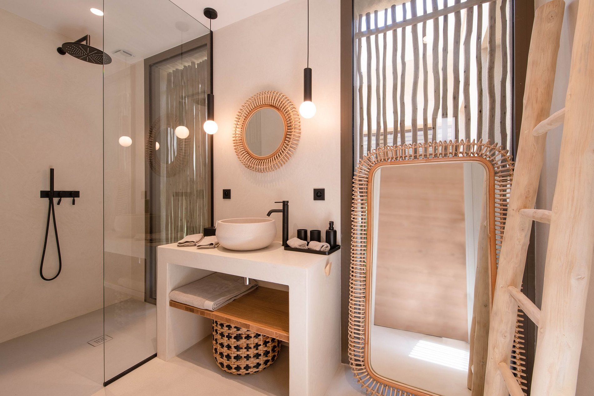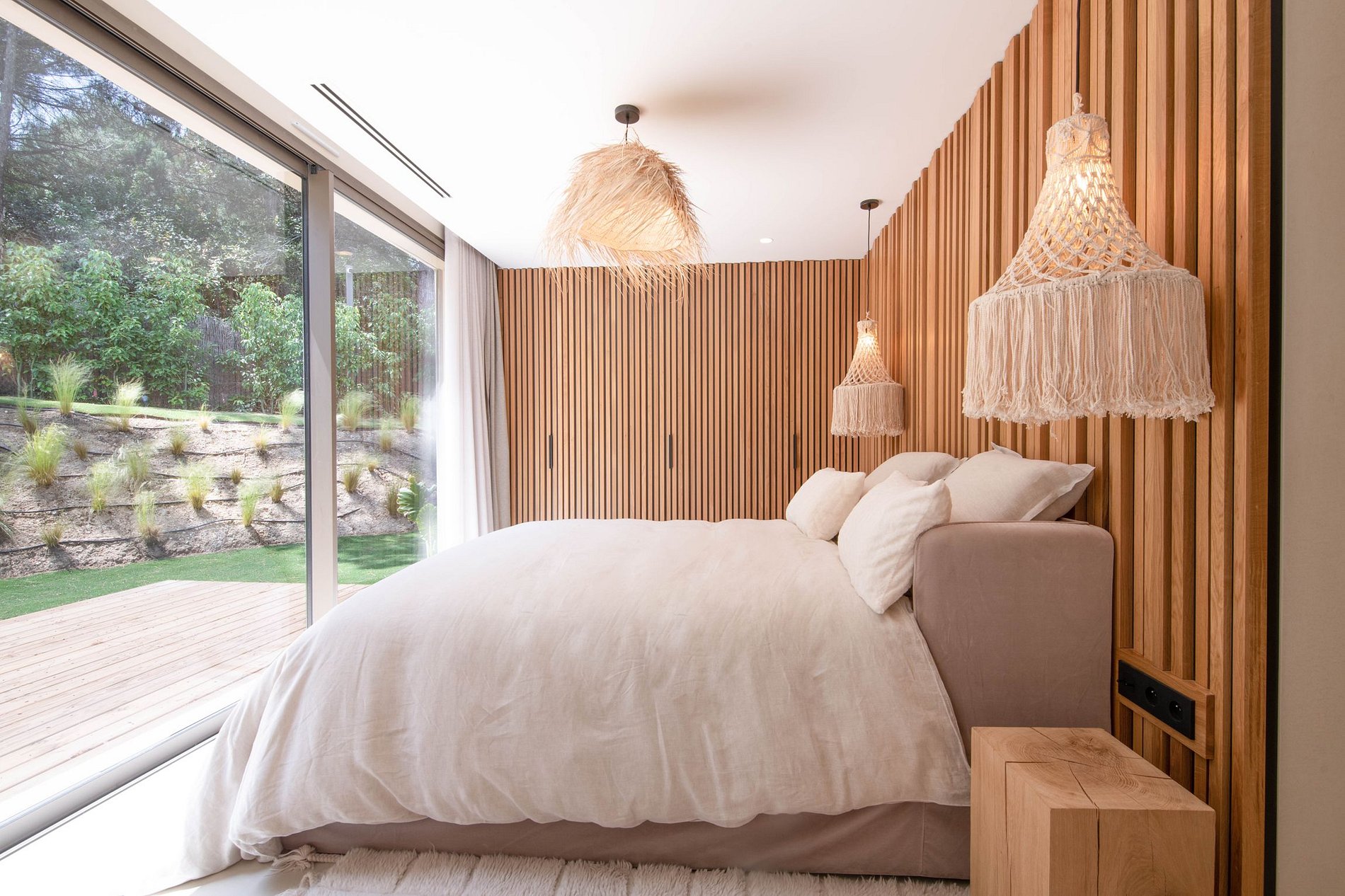 La villa puede acomodar hasta 12 personas: Cuenta con cuatro suites en la planta baja y una suite en el piso de arriba con baño y ventanales que ofrecen una terraza con vista completa al jardín.