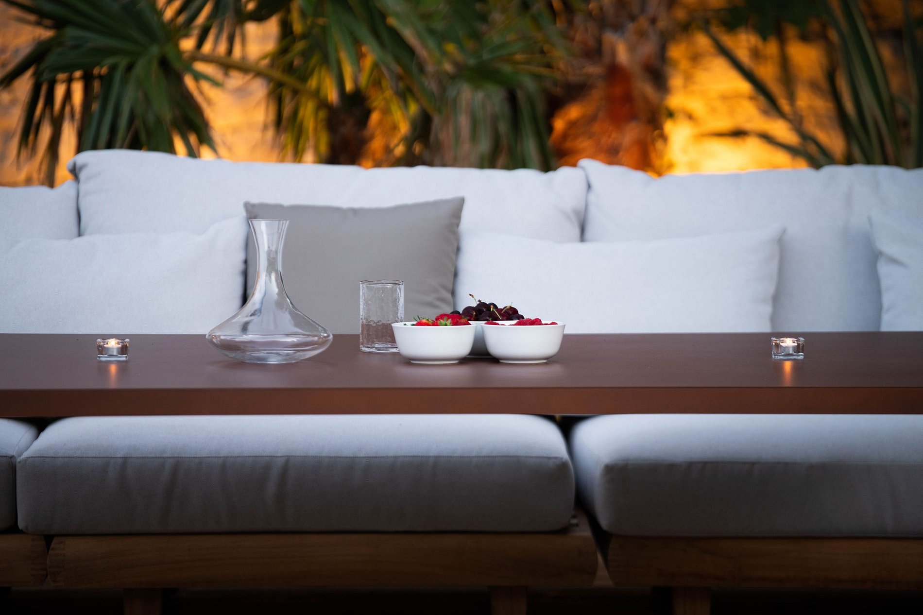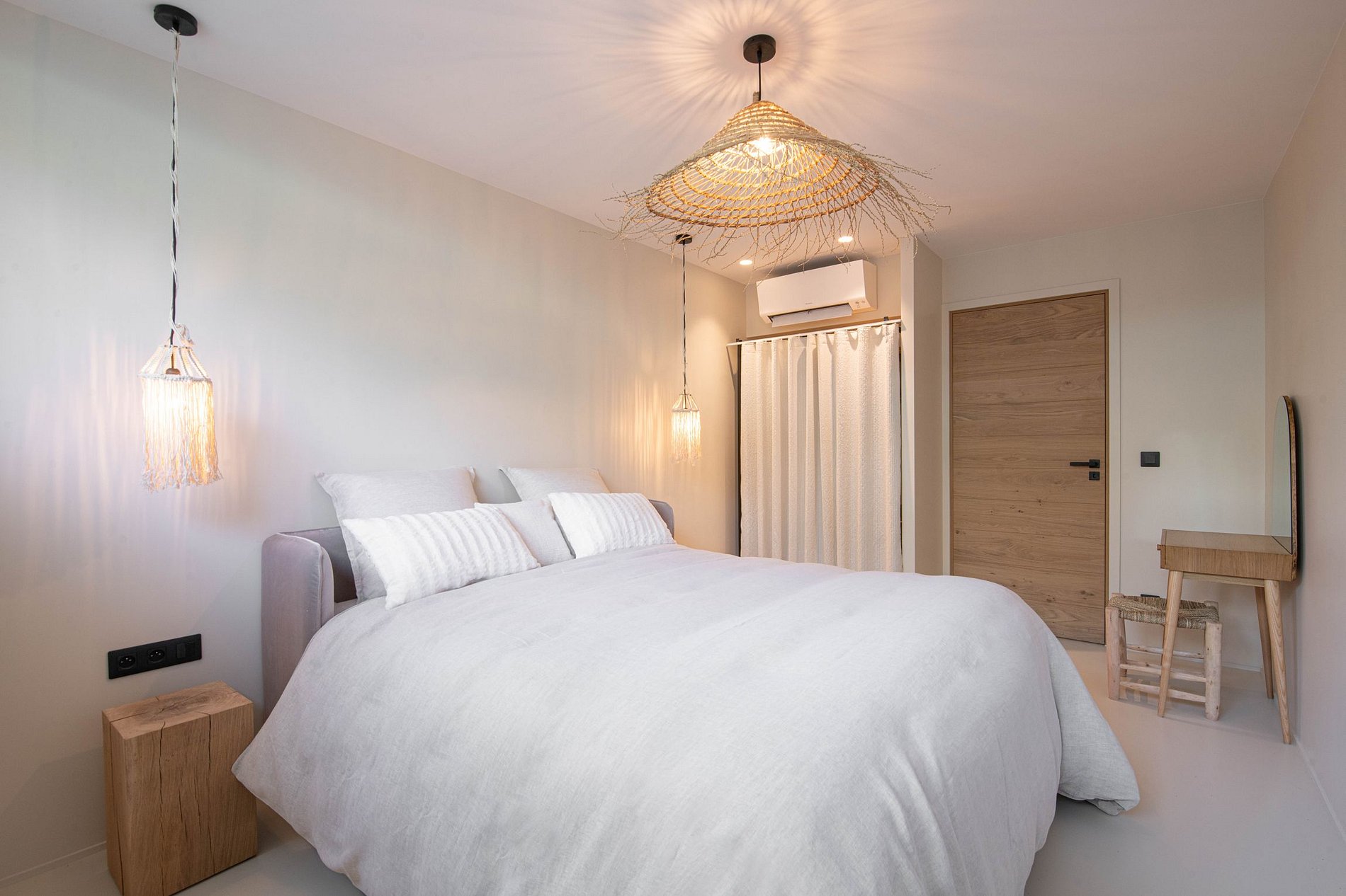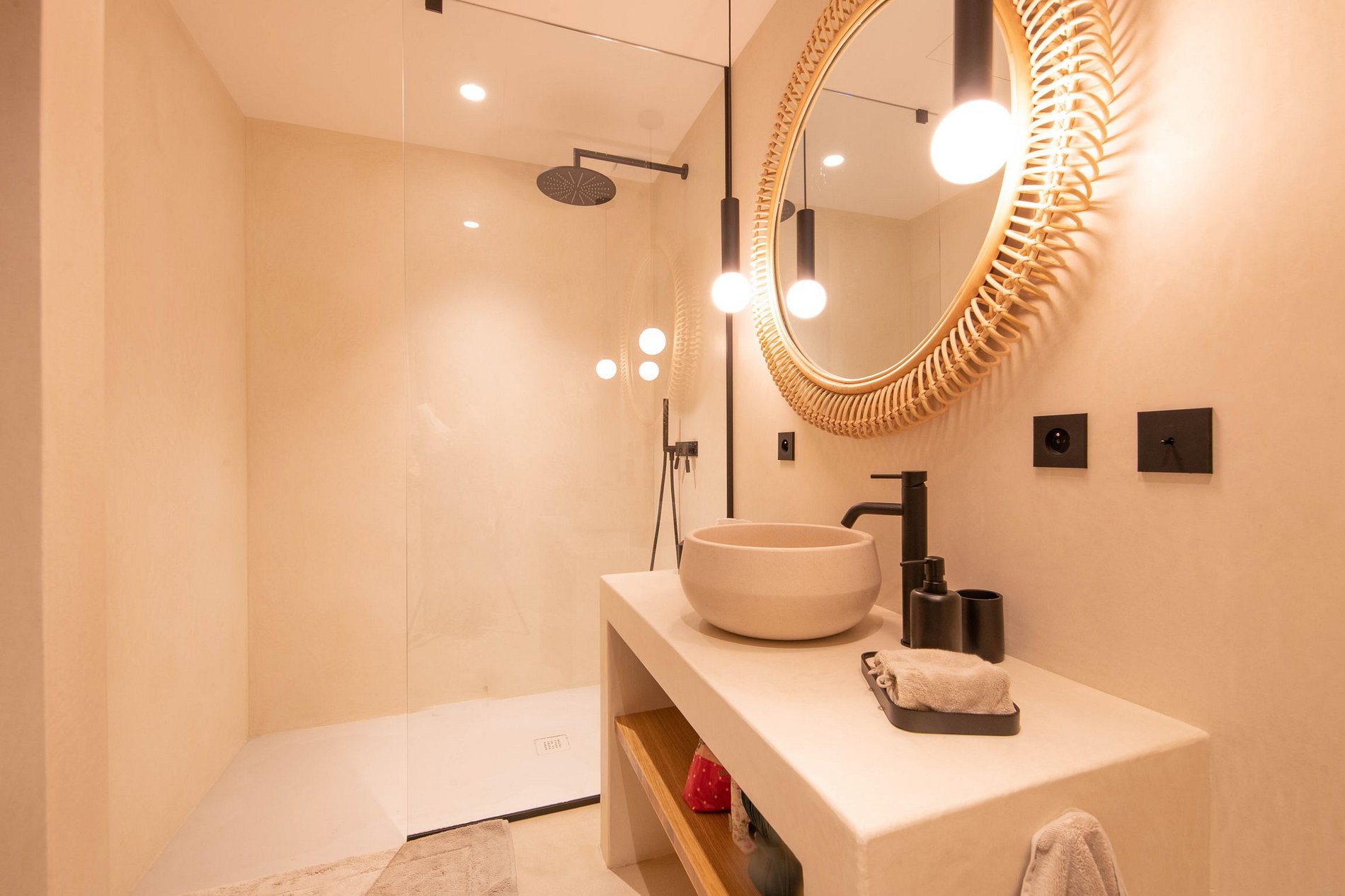 La villa puede acomodar hasta 12 personas: Cuenta con cuatro suites en la planta baja y una suite en el piso de arriba con baño y ventanales que ofrecen una terraza con vista completa al jardín.