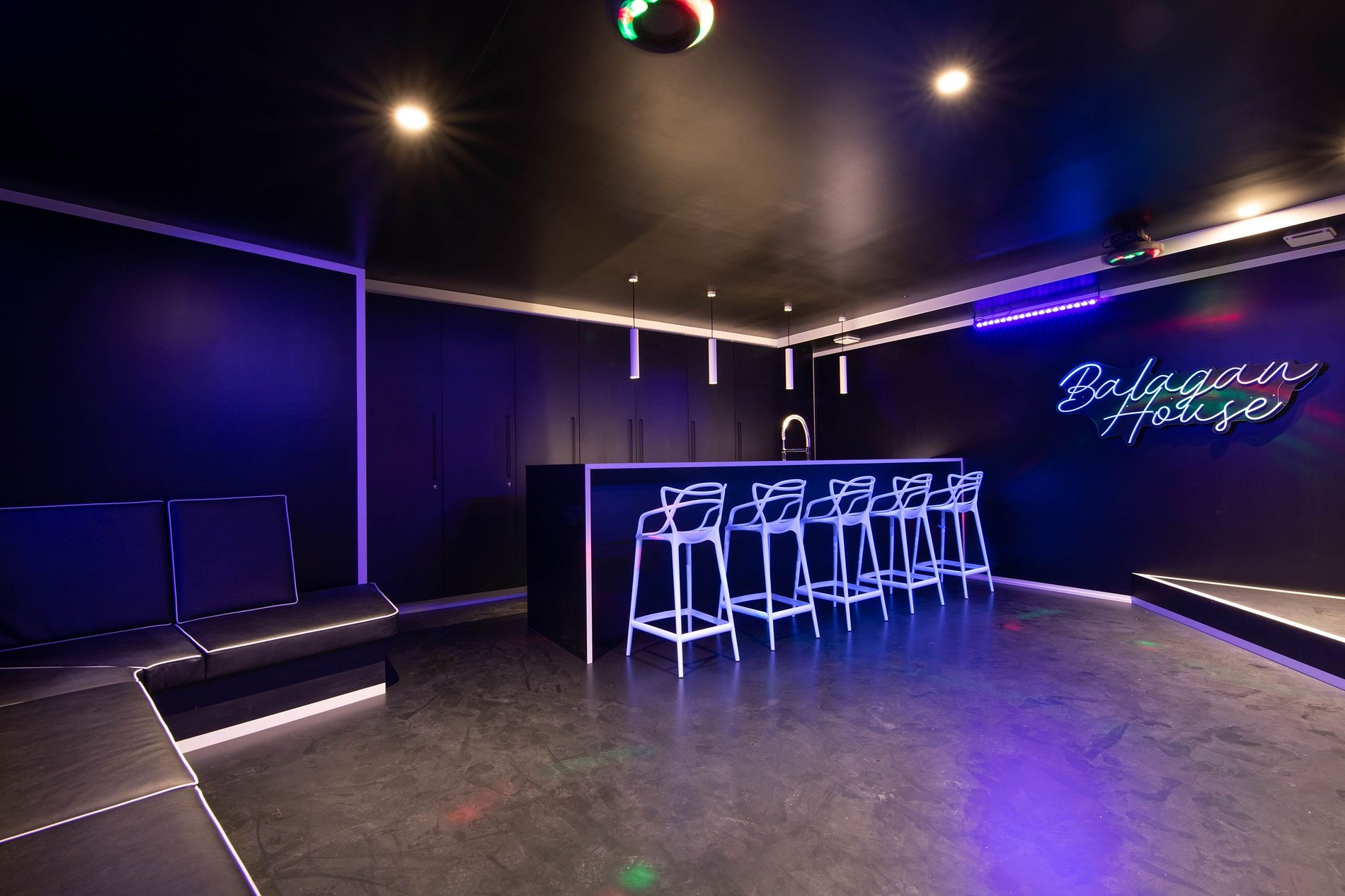 En el sótano los huéspedes pueden encontrar una sala de juegos y baños y un dormitorio más. La Villa consta de un gran salón con acceso a espacios verdes y terrazas, una cocina, una discoteca y una sala de masajes.