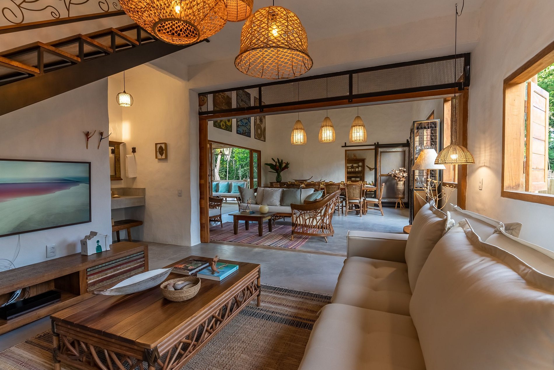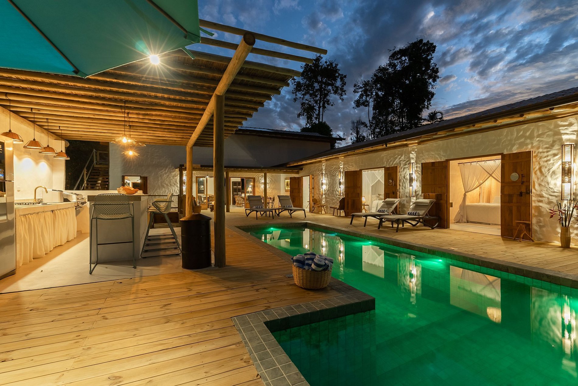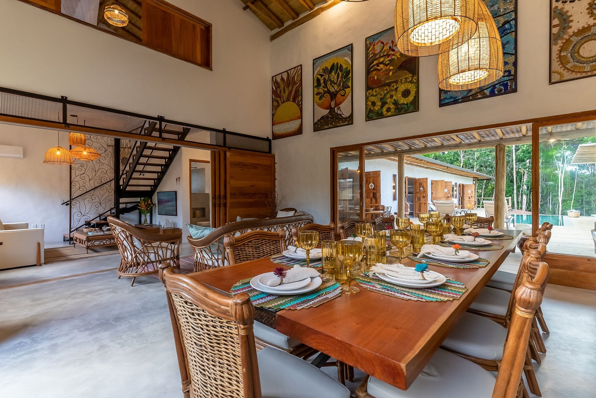 De estilo rústico pero sofisticado, se destaca con el yeso Santa Fé y con la decoración valorando la artesanía brasileña, con piezas de artesanos de varios estados de Brasil. La casa cuenta con 5 dormitorios, 4 de los cuales son suites y 1 baño que da servicio al dormitorio del entrepiso (todos con aire acondicionado), sala de TV, sala y comedor, una acogedora hamaca en un amplio jardín, área gourmet con barbacoa y mesa de comedor. al aire libre, piscina infinita y una vista impresionante del bosque nativo y una ducha al aire libre.