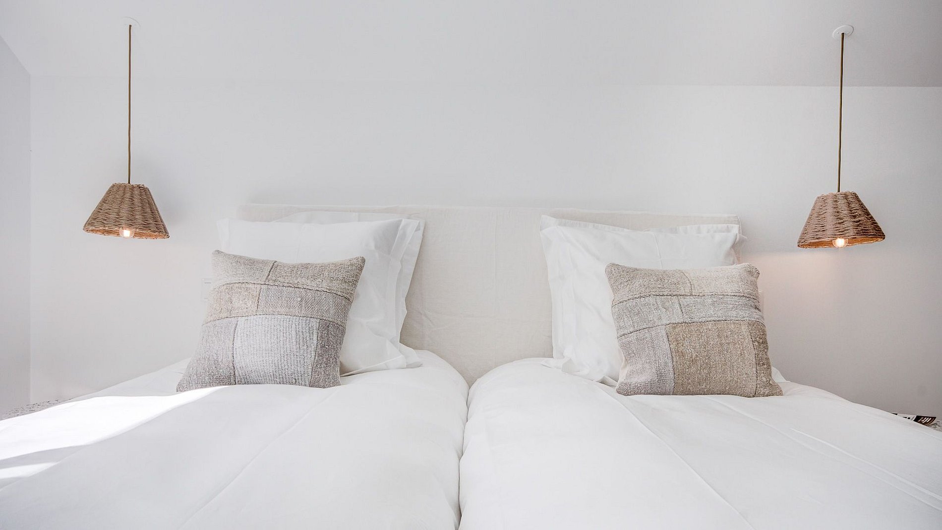 El espacioso interior de las áreas de estar y las habitaciones íntimas con una vista al patio de la piscina, con todas las ventanas que dan al interior, lo cual ofrece privacidad. Los dormitorios se distribuyen en dos plantas, zona de estar con chimenea, cocina totalmente equipada y salón-comedor diáfano unido a un techo de doble altura. También hay una biblioteca en el altillo con un sofá.