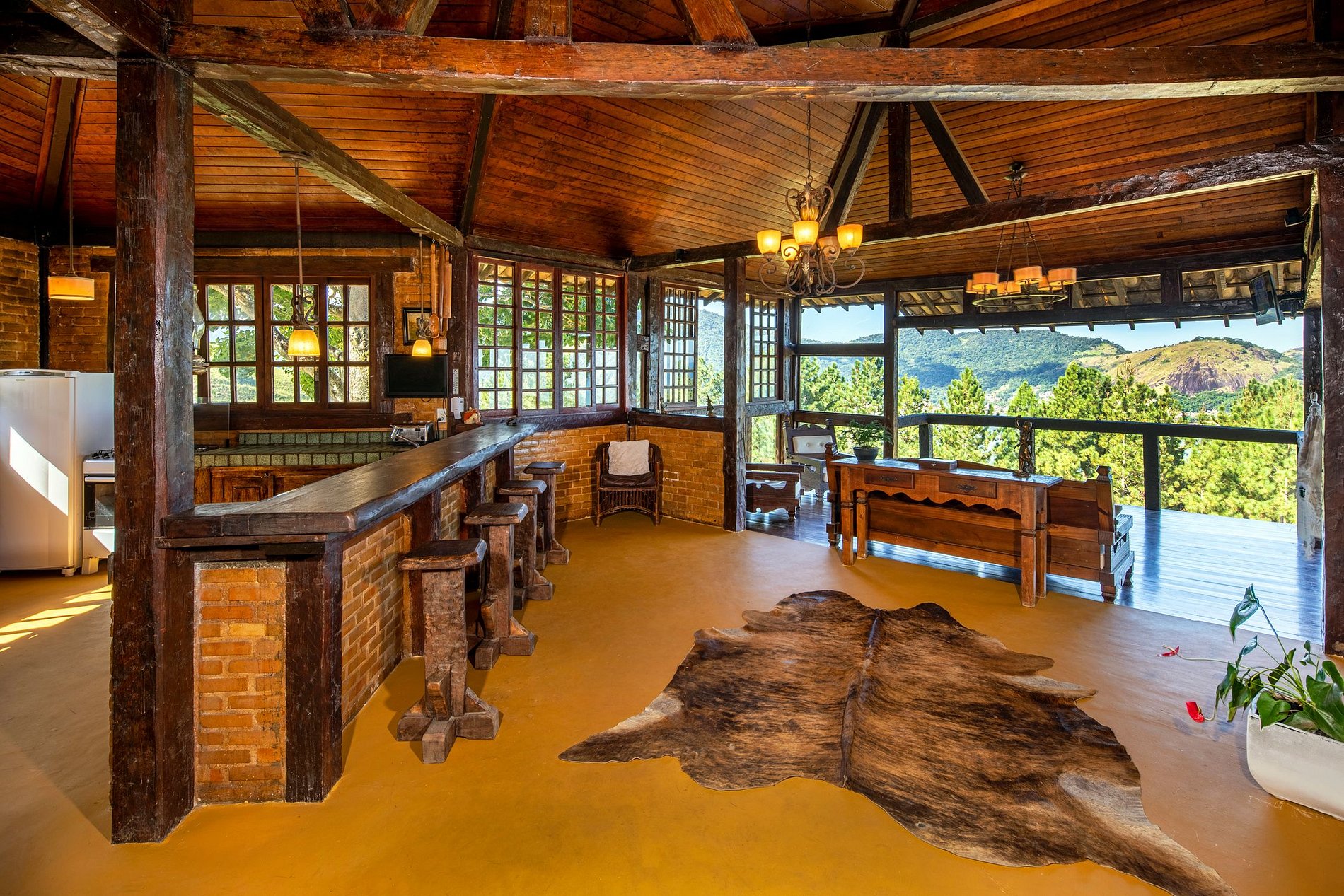 El interior de la casa principal tiene un diseño rústico colonial con muebles de madera maciza de alta calidad y paredes de ladrillo barnizado.