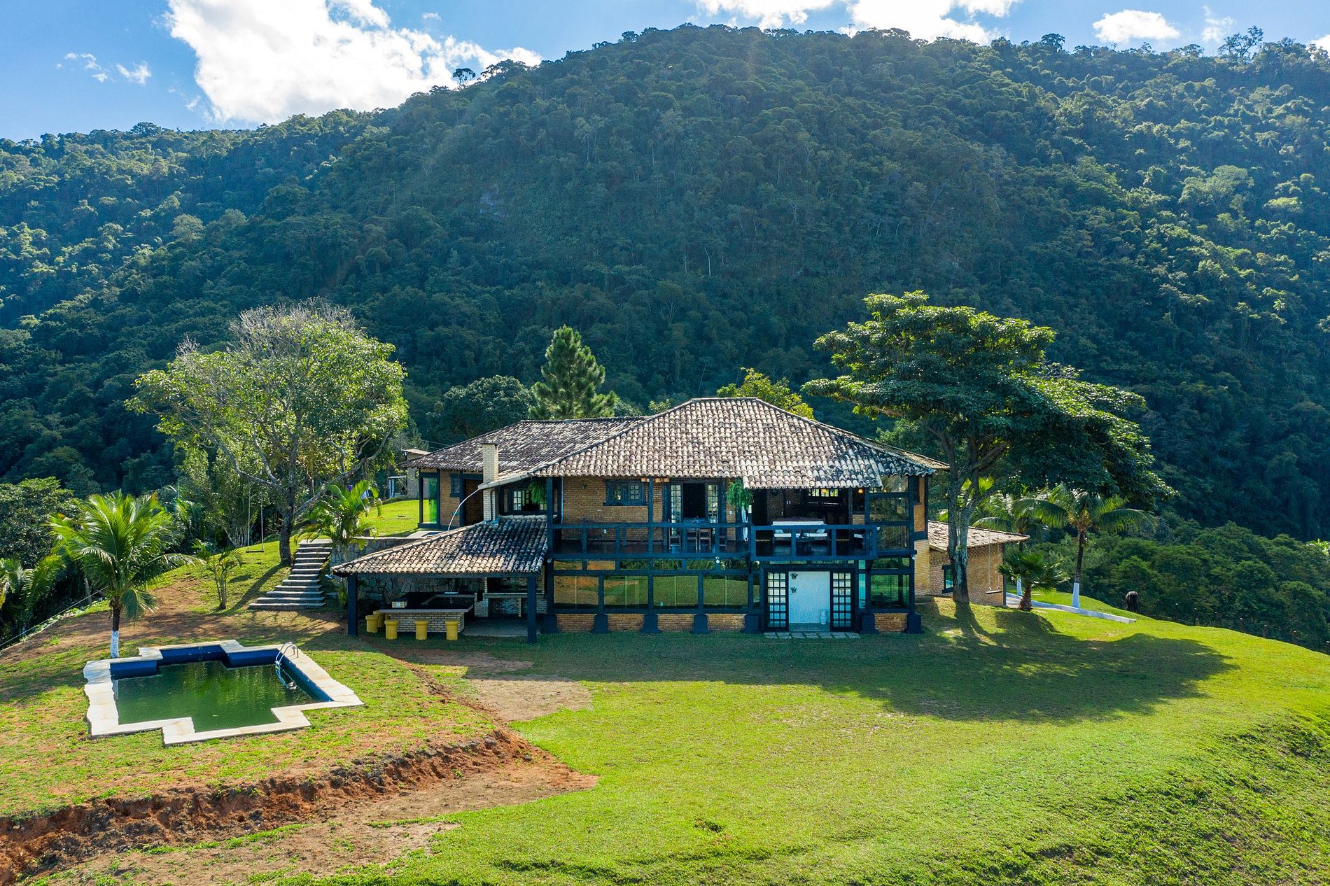 Hay 25 mil metros cuadrados de área de la propiedad, en su mayoría cubiertos por un hermoso jardín verde, rodeado de naturaleza y montañas, brindando una vista impresionante.