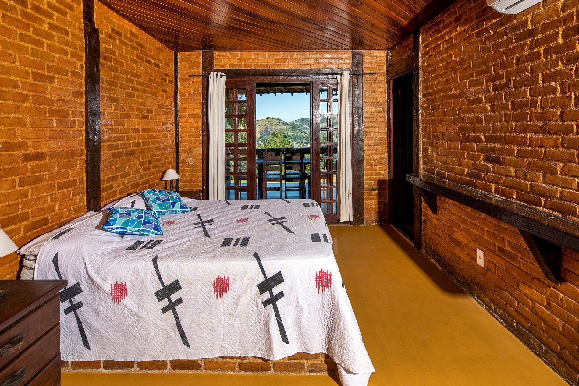 El interior de la casa principal tiene un diseño rústico colonial con muebles de madera maciza de alta calidad y paredes de ladrillo barnizado.