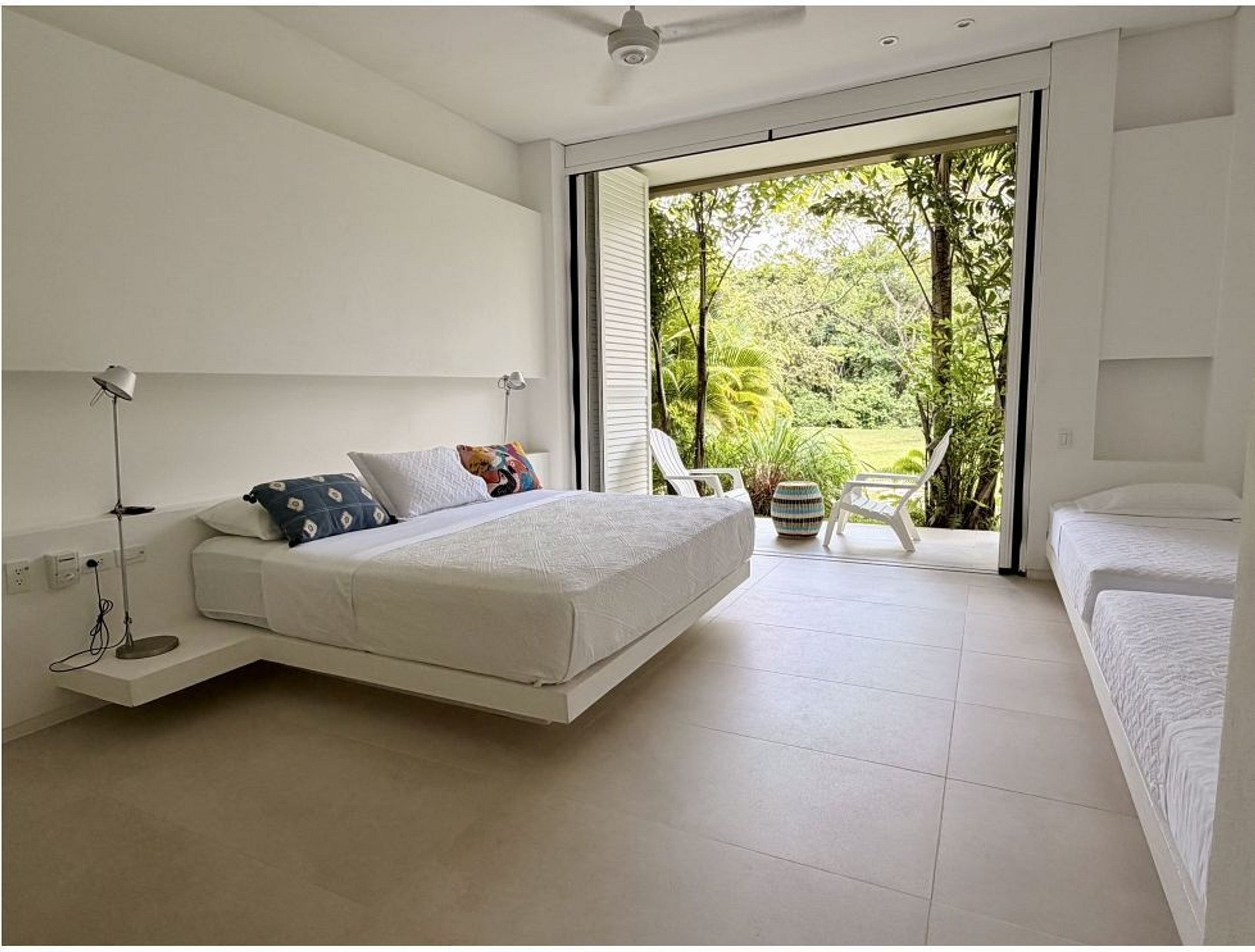 Las cinco habitaciones cuentan con ventilador y baño privado. Adicionalmente, la casa dispone de dos baños para invitados. La distribución de camas es la siguiente: – Una habitación con 1 cama King y 2 camas Full – Una habitación con 1 cama King y 1 cama sencilla – Dos habitaciones cada una con 1 cama King y 2 camas Full – Una habitación con 1 cama King
