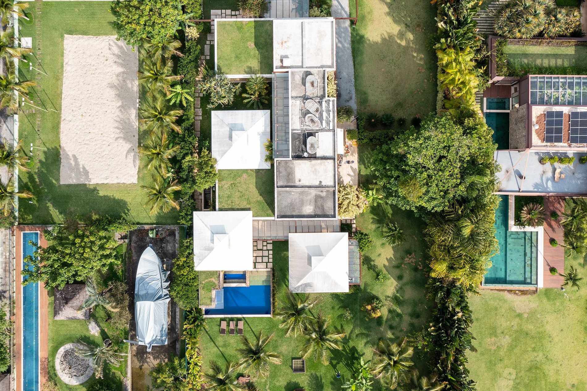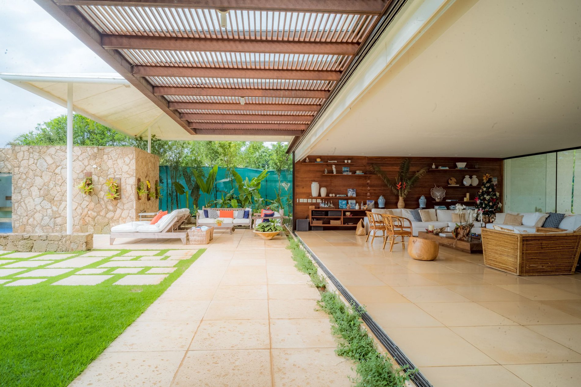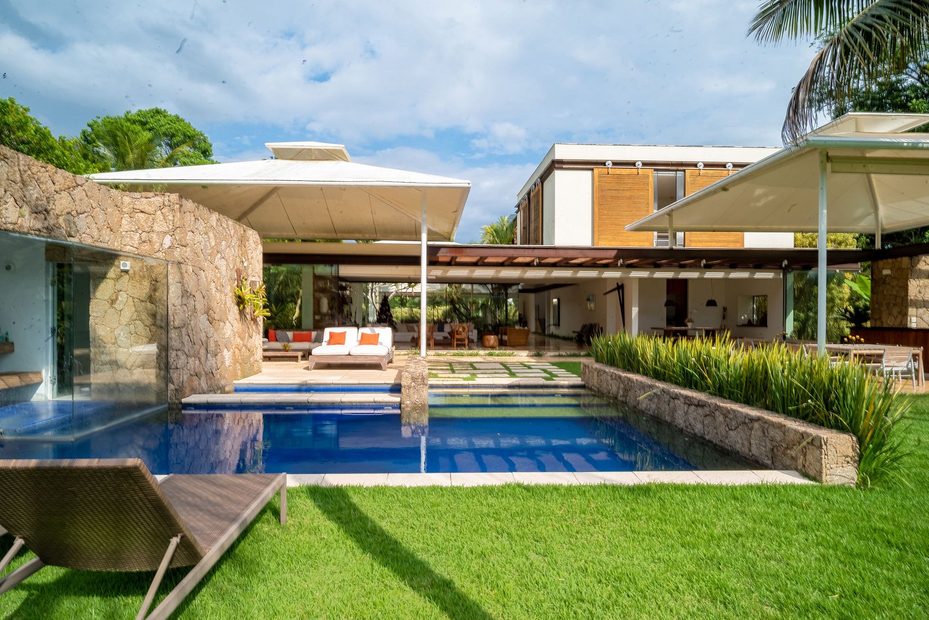 La residencia también ofrece una gran área cubierta al aire libre con diferentes áreas dedicadas a la cocina: una barbacoa, un horno de pizza y dos dormitorios para garantizar la comodidad de todos. El diseño sofisticado, que se refleja en todo el edificio, contribuye a una sensación de bienestar.