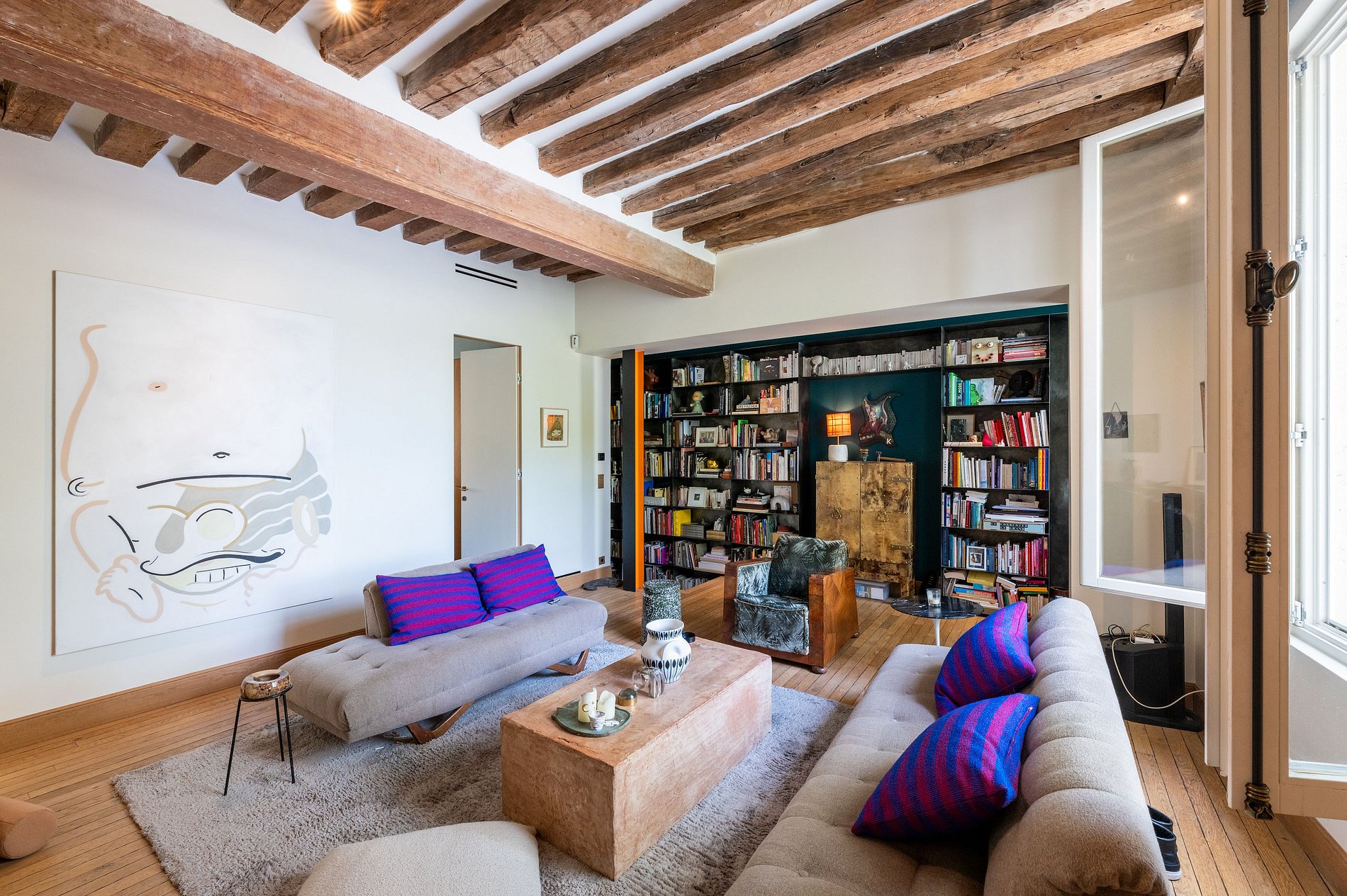 Al ascender al piso superior, descubrirás una sala de estar cálida y acogedora, adornada con vistas al río Sena y, hacia el este, la majestuosa Catedral de Notre Dame. Este espacio acogedor invita a la relajación y la contemplación, ofreciendo el escenario perfecto para relajarse después de un día de exploración por la ciudad.