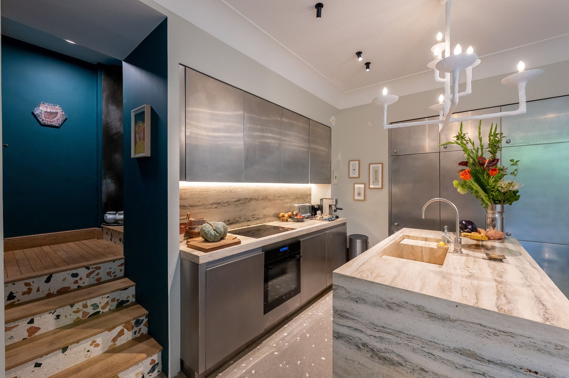 Al entrar, te da la bienvenida una cocina totalmente equipada que se abre a un exuberante patio, creando un oasis tranquilo en el corazón de la ciudad. Unos escalones más abajo, te espera el comedor, que cuenta con un espacio elevado ingeniosamente diseñado al que se accede por una escalera. Aquí, una gran cama espera, ideal para un adolescente o una pareja joven, acompañada de un pequeño baño privado para mayor comodidad.
