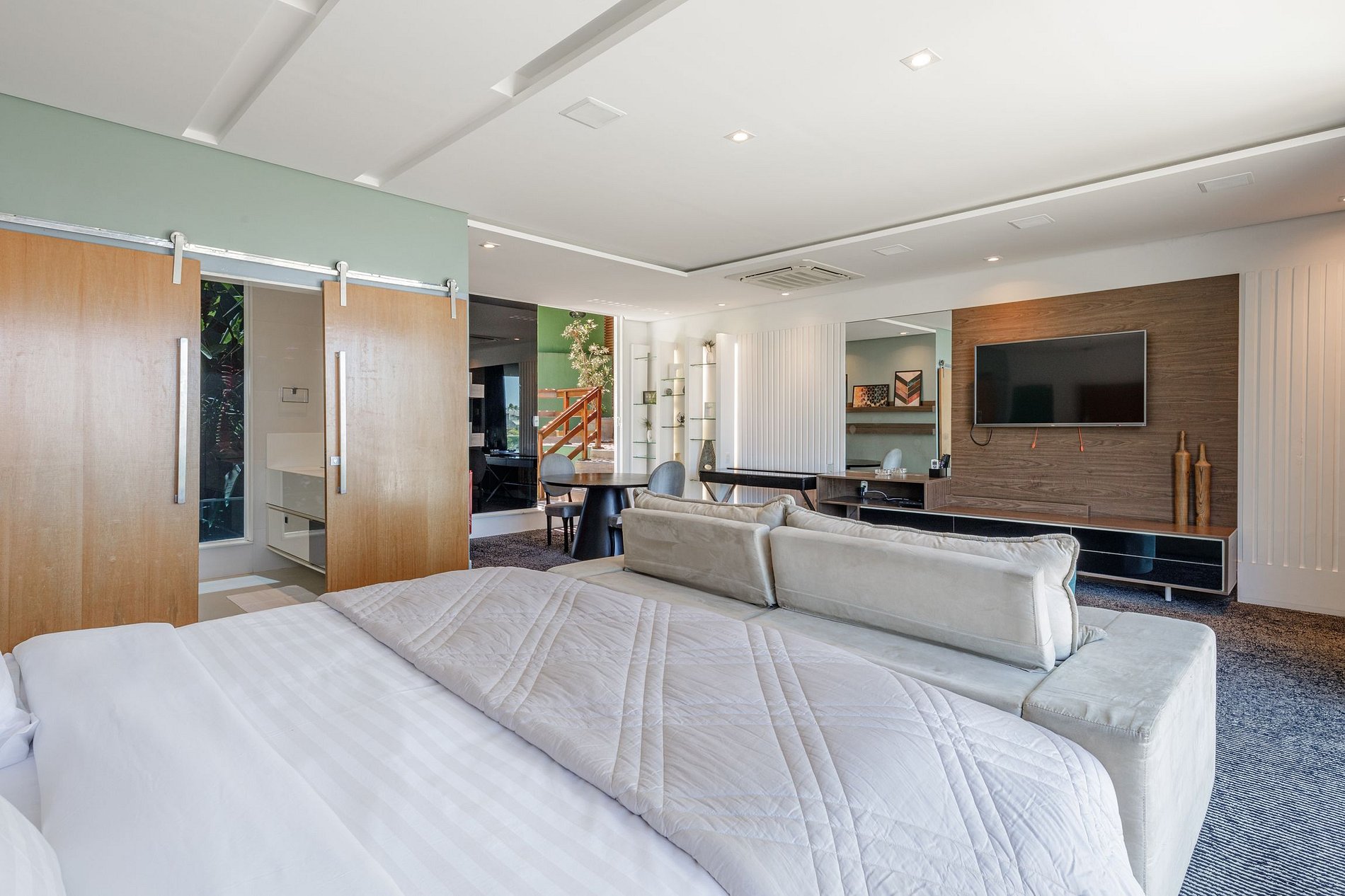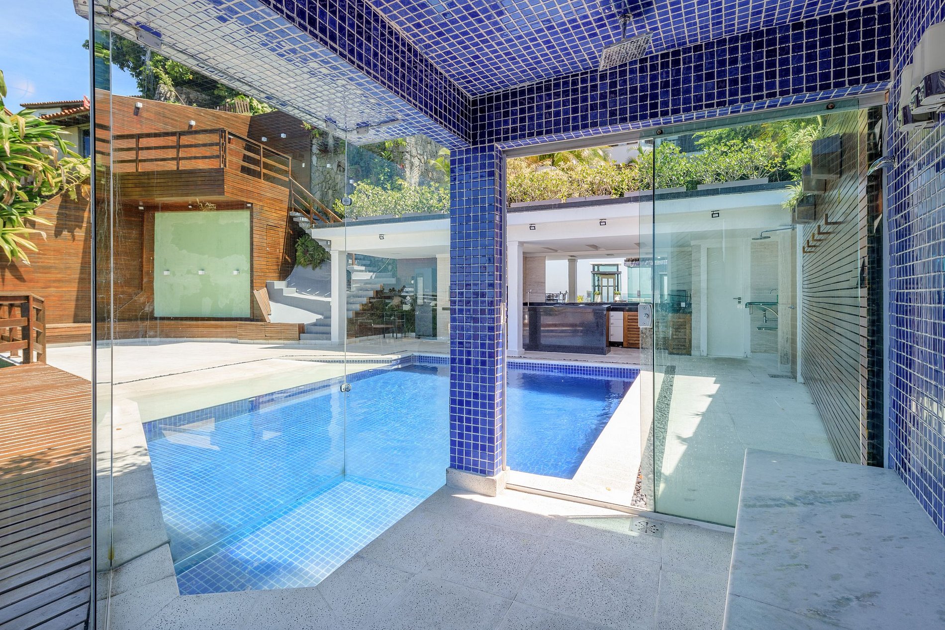 La mejor manera de disfrutar de esta asombrosa vista es en las tumbonas de diseño tropical de la inmensa terraza de construcción magistral con efectos infinitivos. Si se siente como para refrescarse del calor de Río, no hay mejor lugar que la elegante piscina incrustada en la terraza. El lujoso interior de esta mansión única no deja ningún deseo sin cumplir. Los salones y comedores son muy abiertos y amplios, diseñados con techos altos, modernos y cómodos al mismo tiempo. También hay un bar alineado con la sala de estar que le da al lugar un ambiente relajado, seguro que pasará algunas noches inolvidables con sus seres queridos aquí. Además, el lugar posee un amplio gimnasio profesionalmente equipado y una sauna.