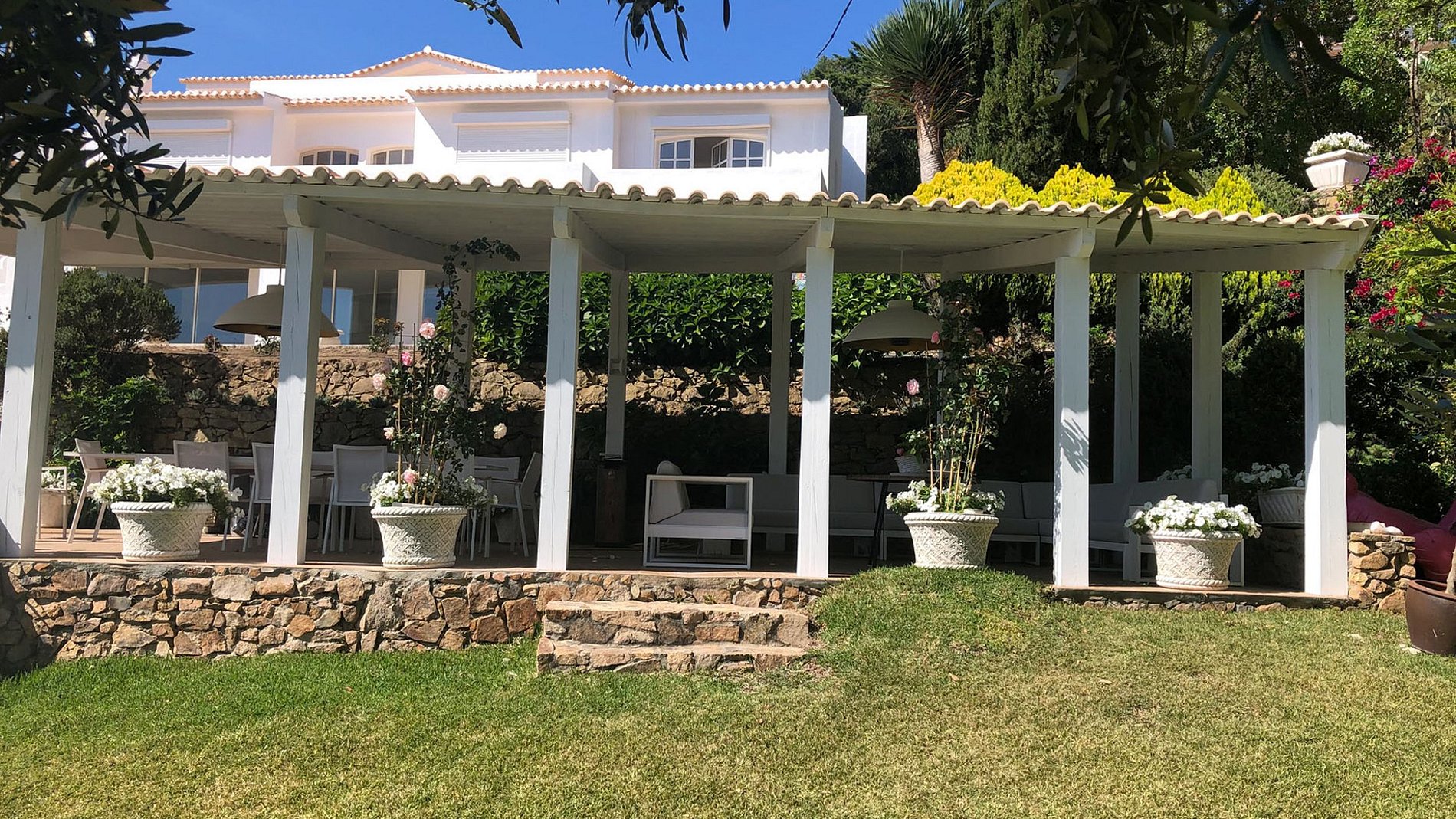 Hay seis suites, cada una con un baño con capacidad para 12 personas. En el exterior, una gran terraza corre a lo largo de la casa con una vista despejada del Océano Atlántico y la costa de Guincho. Una amplia zona de césped con palmeras ofrece total privacidad y sombra durante los cálidos días de verano, mientras que la piscina con su pérgola contigua, bar y barbacoa gana la atención.