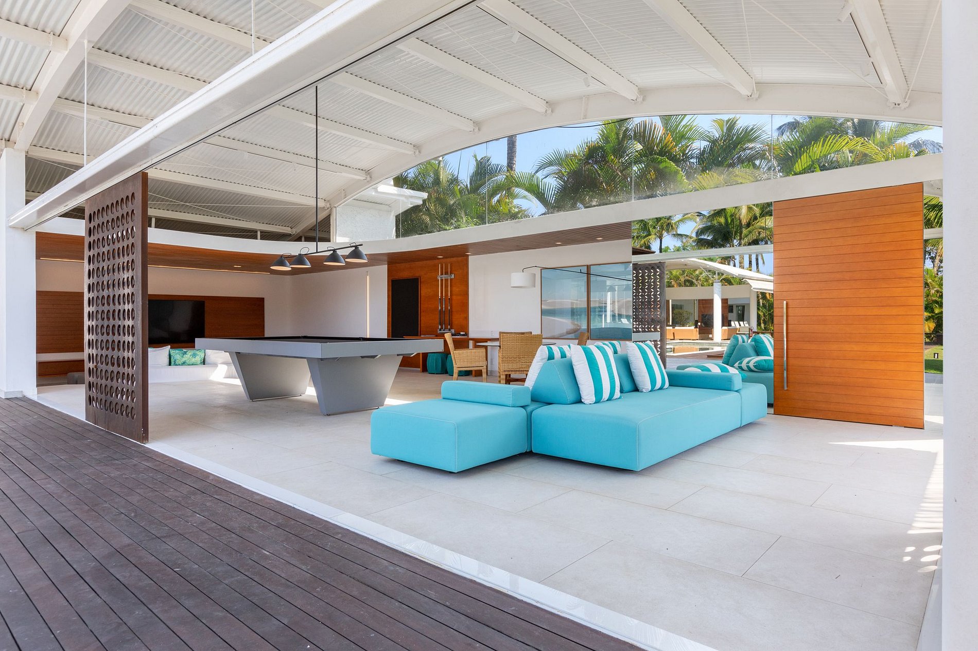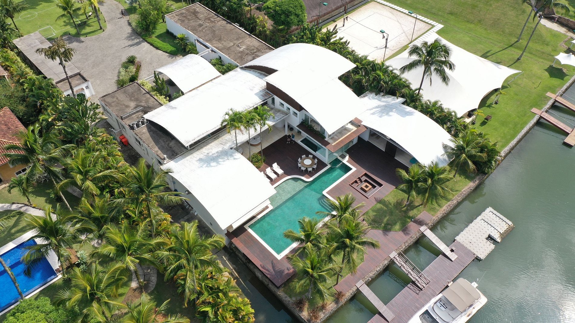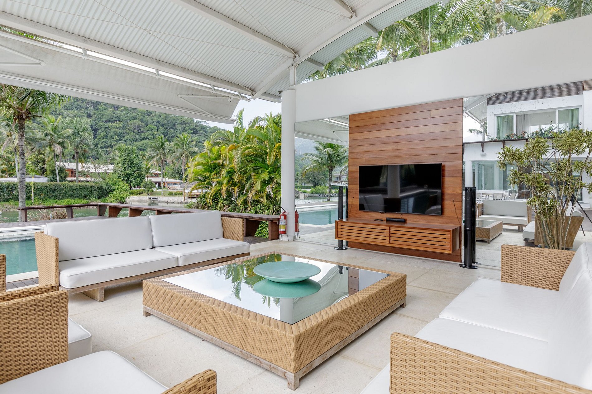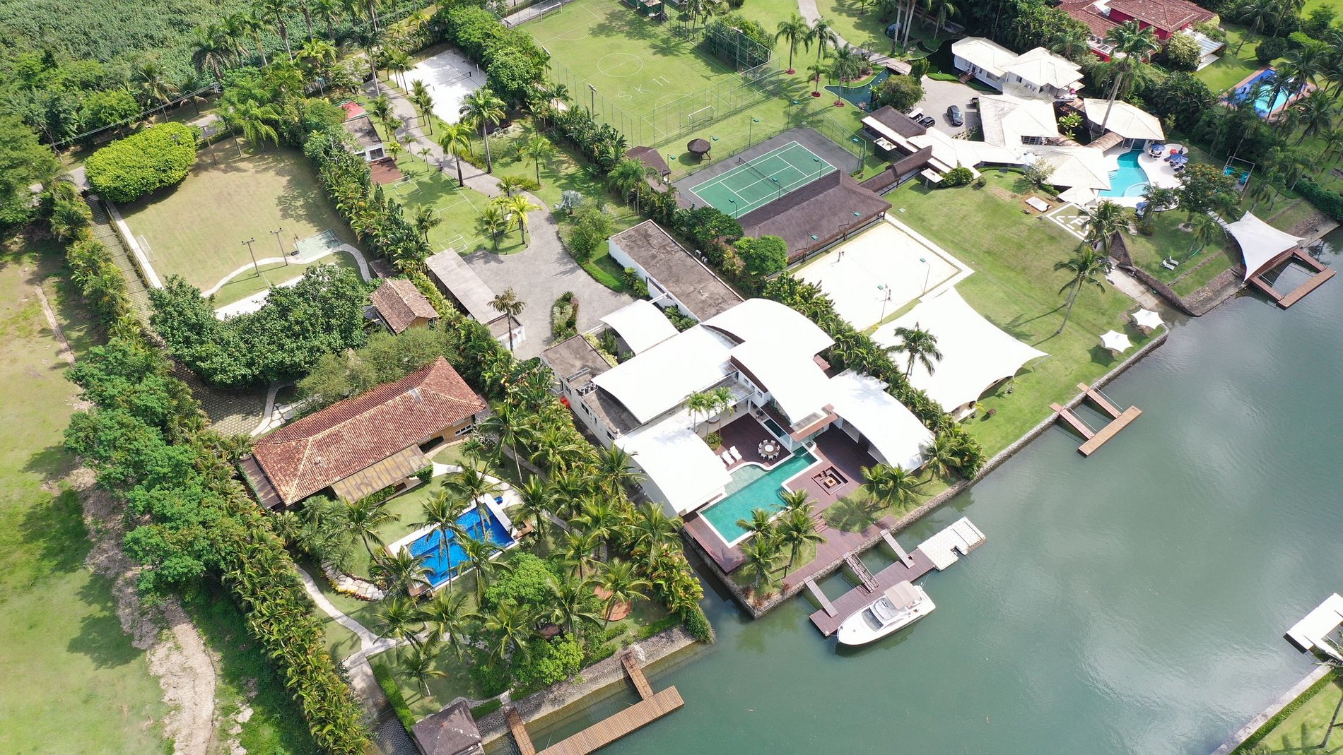 La villa cuenta con una cómoda sala de estar, con sistema de sonido, mesa de comedor y grandes puertas de vidrio, que brindan una agradable vista a la piscina y al muelle; Con 7 suites con aire acondicionado, este paraíso tiene capacidad para 16 personas y ofrece una hermosa vista de la región en todas las habitaciones.