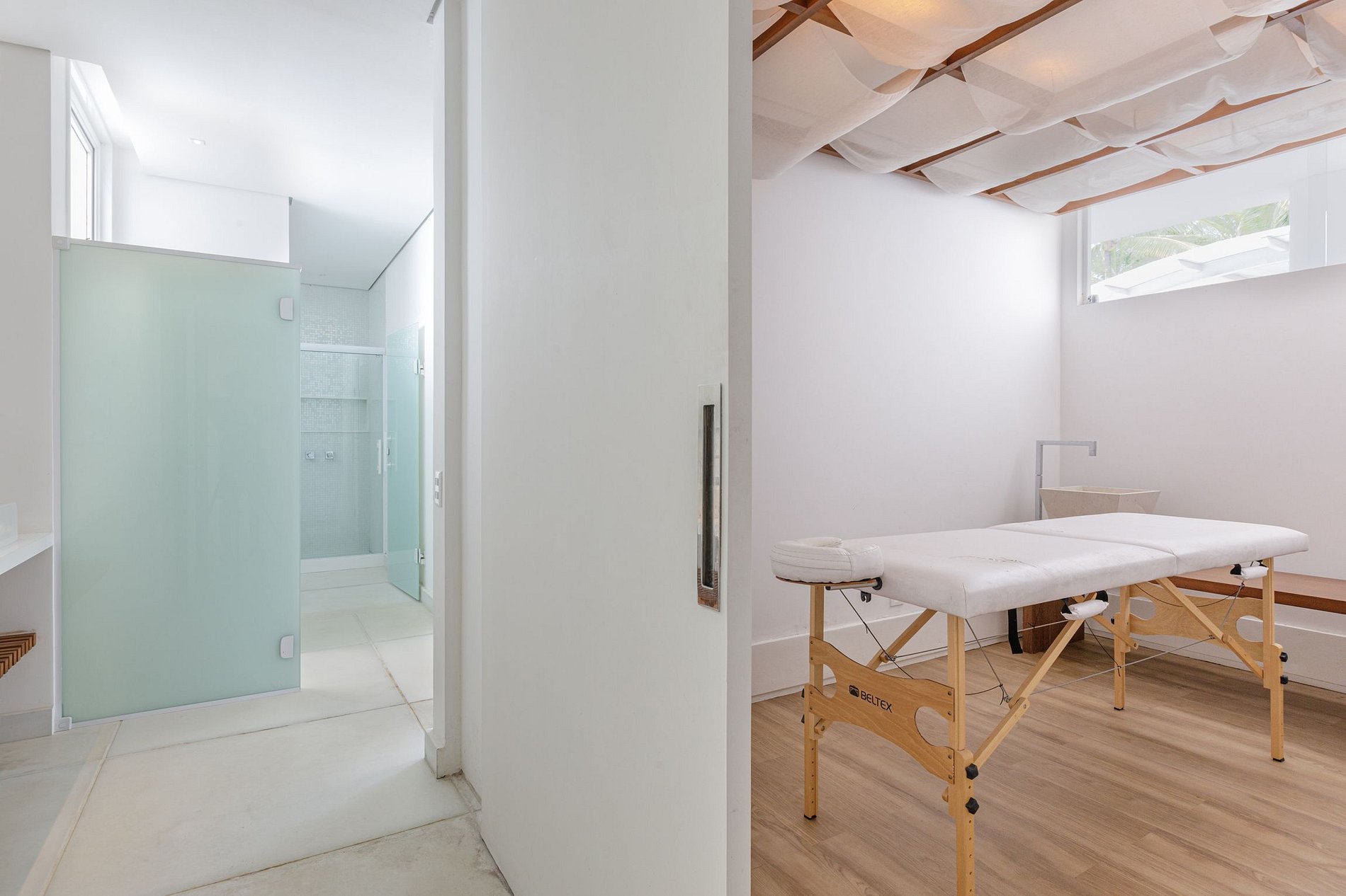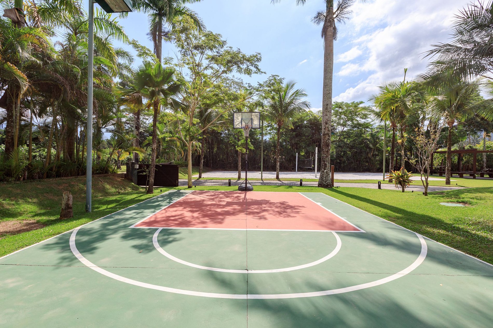Para hacer ejercicio, contamos con una pequeña cancha de baloncesto, área de voleibol de playa y una gran piscina con deck de madera. La piscina tiene un lado poco profundo para niños y un área profunda, perfecta para nadar y practicar deportes acuáticos, además de un espacio con asoleadoras para disfrutar del sol. El sauna y la sala de masajes son la ventaja de esta casa, que cuenta con toda la estructura para una estancia relajante.