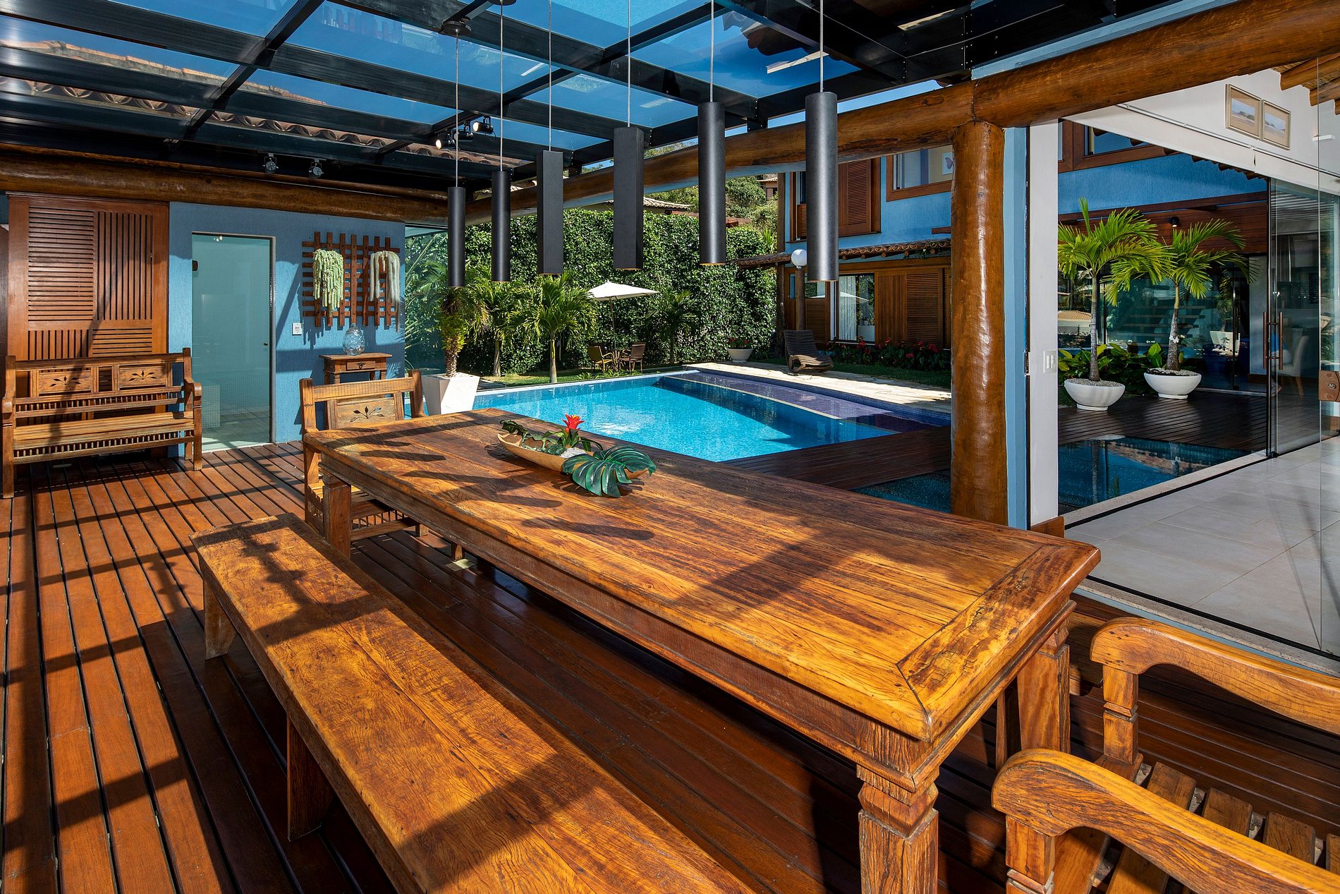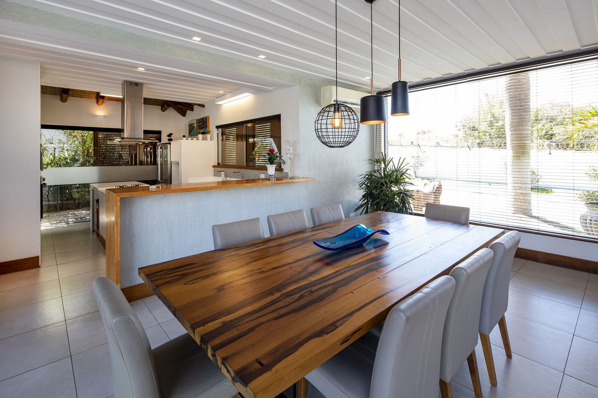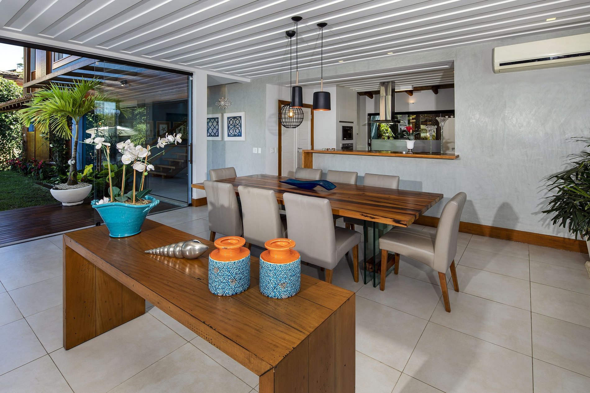 En la entrada, la casa le da un aspecto ecológico, así como el nombre del condominio en el que se inserta. Un pasillo que da acceso a absolutamente todas las áreas de la casa, al final de esta, el encuentro con el jardín bellamente decorado con piscina, sauna y barbacoa con deck y muebles de madera de diseño y un hermoso techo de cristal que ilumina toda el área con luz solar y luna.
