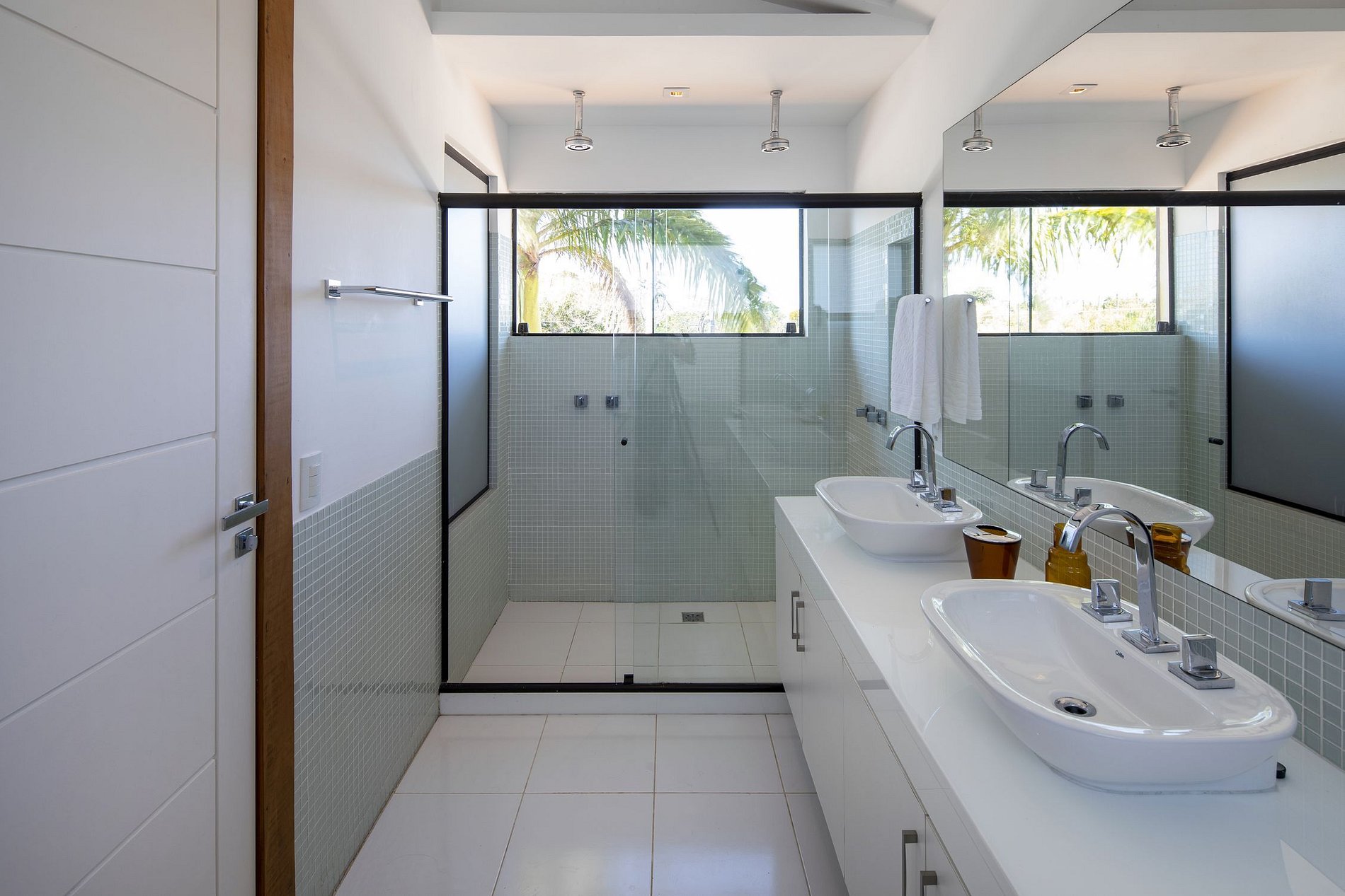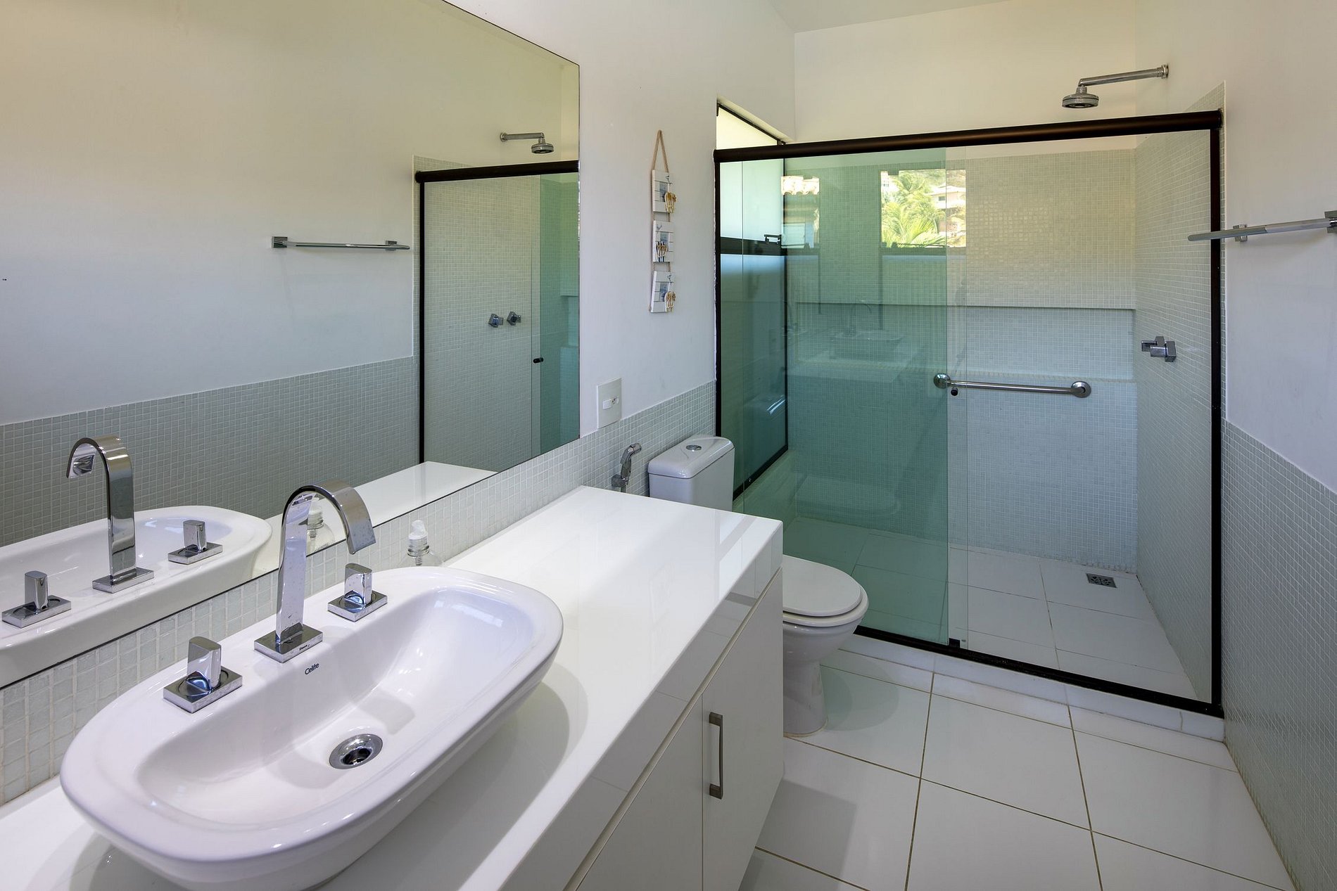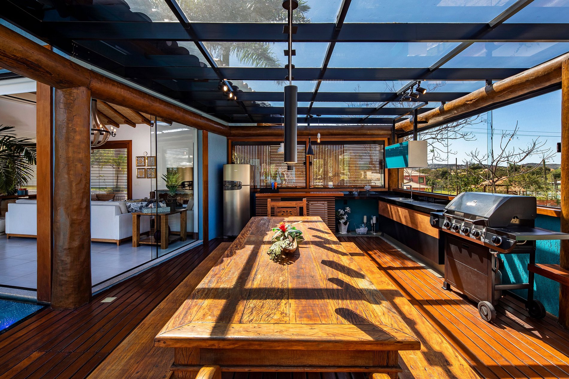 En la entrada, la casa le da un aspecto ecológico, así como el nombre del condominio en el que se inserta. Un pasillo que da acceso a absolutamente todas las áreas de la casa, al final de esta, el encuentro con el jardín bellamente decorado con piscina, sauna y barbacoa con deck y muebles de madera de diseño y un hermoso techo de cristal que ilumina toda el área con luz solar y luna.
