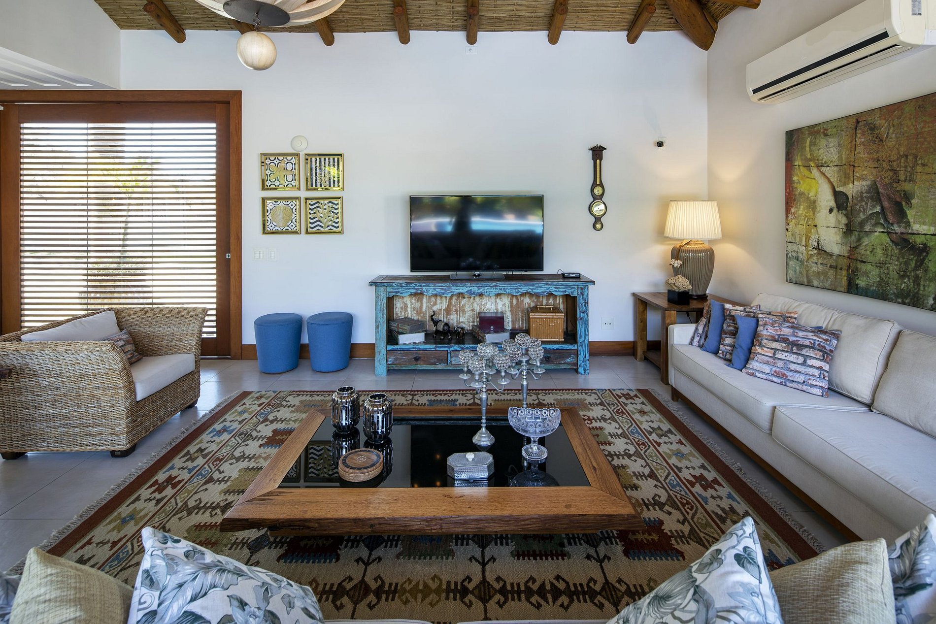 En el primer piso de la casa hay una gran sala que respeta el equilibrio entre lo contemporáneo y lo ecológico con muebles y cuadros que hacen que cualquiera se sienta en contacto con la naturaleza sin descuidar la modernidad además de una suite y una habitación de invitados o empleado particular.