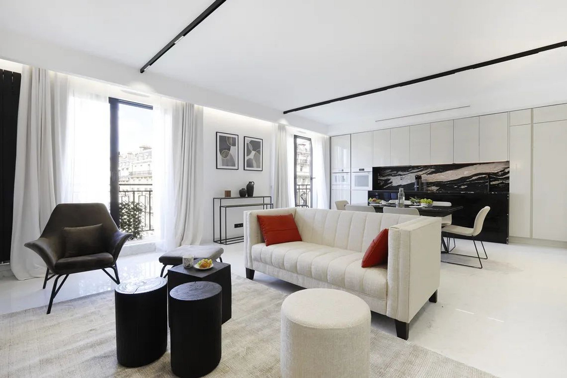 La decoración de este apartamento está cuidadosamente elegida, combinando elementos contemporáneos con un toque de sofisticación parisina. Los acabados de alta gama, los materiales de calidad y los detalles de diseño aportan una atmósfera elegante a cada habitación.