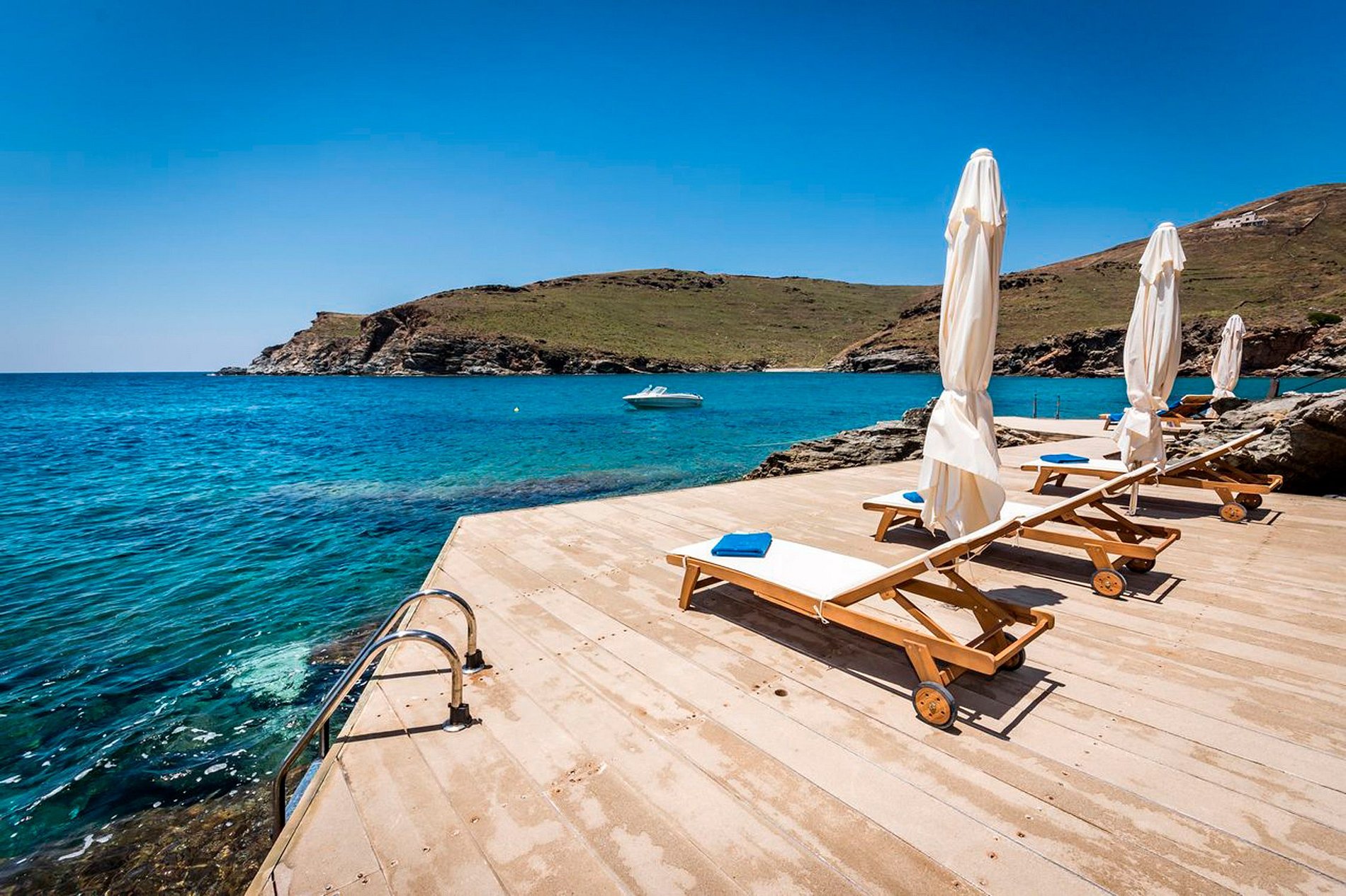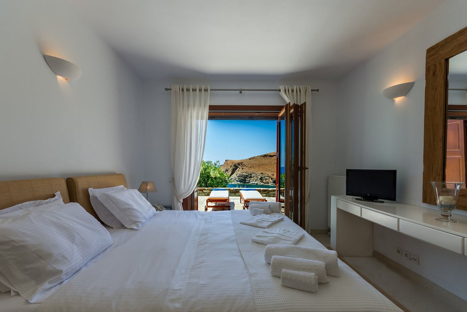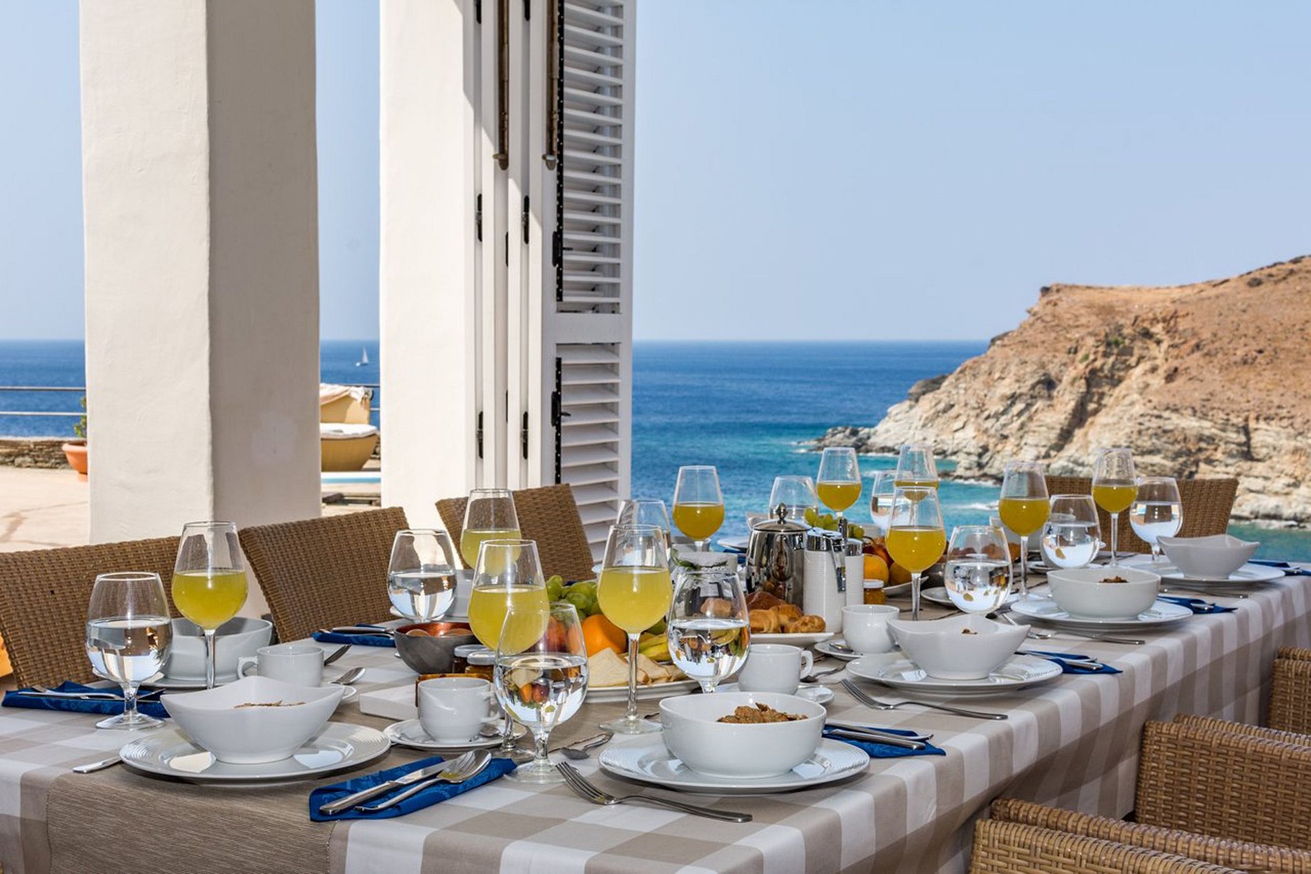 Cuidadosamente construida para su total privacidad y comodidad, realzada con la luz de los patios al aire libre y espacios de descanso con vista al mar Egeo. Diseñada con buen gusto por un arquitecto local, la villa incorpora elementos naturales del paisaje de Siros que crece orgánicamente a su alrededor.