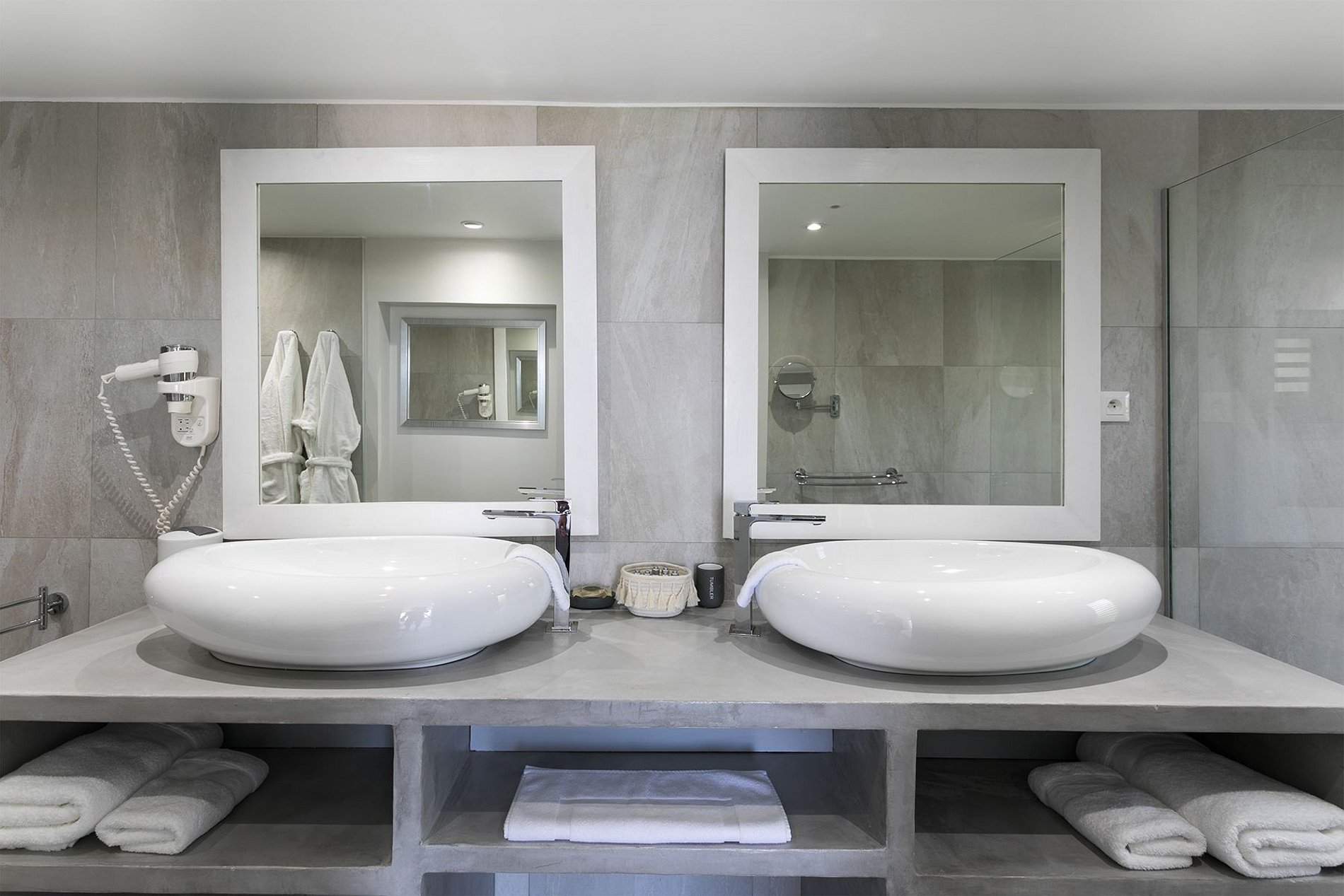 El área exterior se organiza alrededor de una piscina privada orientada hacia el horizonte, rodeada por una terraza con tumbonas, zonas de sombra y un espacio para comer al aire libre. Desde esta posición elevada, las vistas se extienden sobre el mar y las islas cercanas, creando una conexión constante con el entorno.