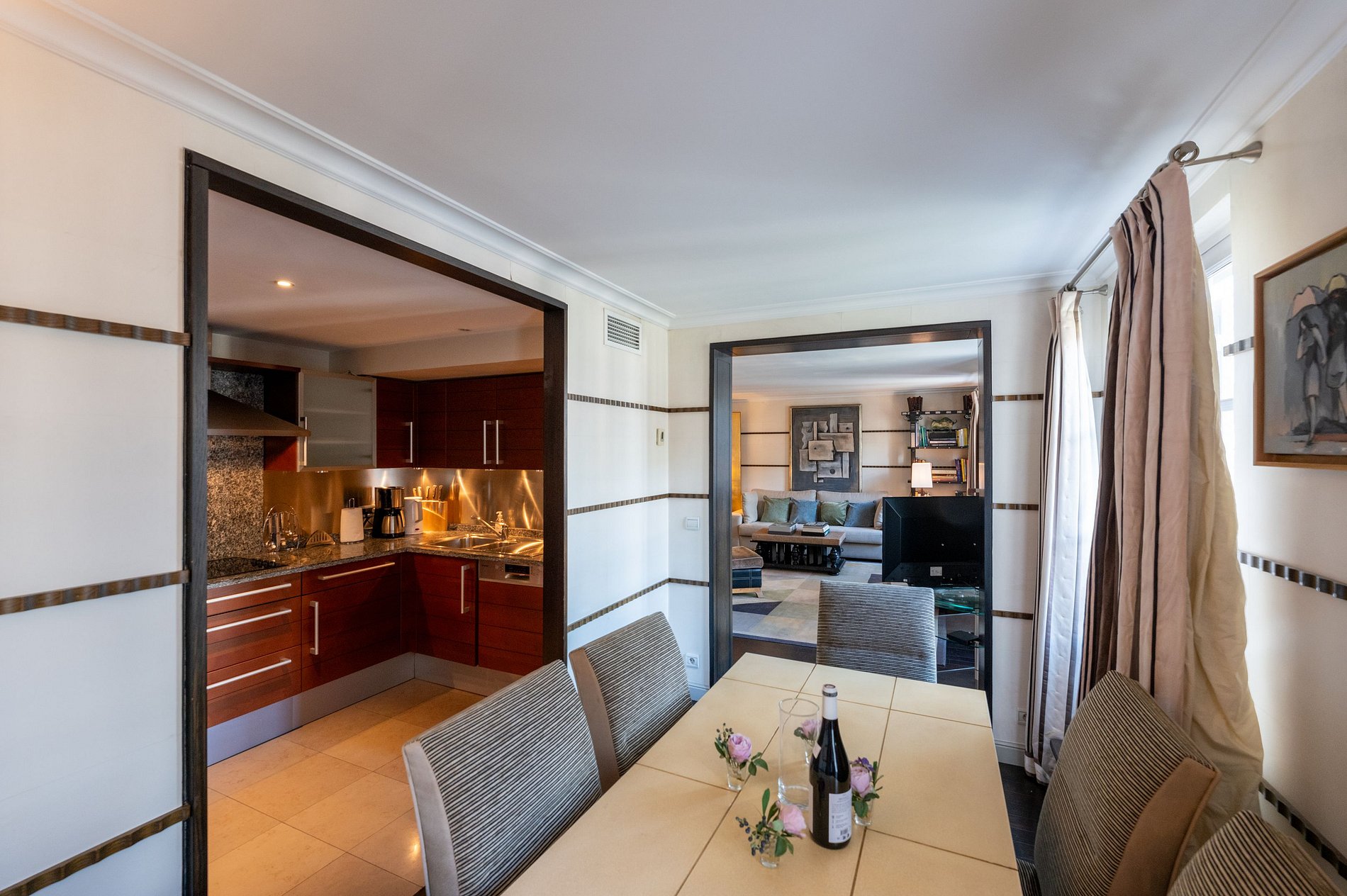 El apartamento, completamente climatizado, cuenta con cómodas áreas de estar, incluyendo un salón y un comedor que se abren a la terraza, ofreciendo una vista impresionante.